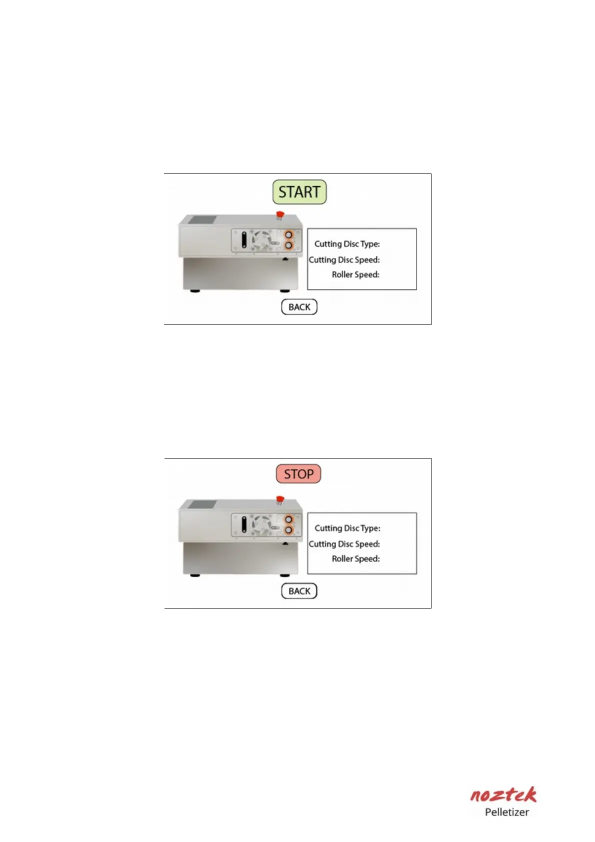 stop the pelletizing process; always press "Stop" first to prevent potential motor