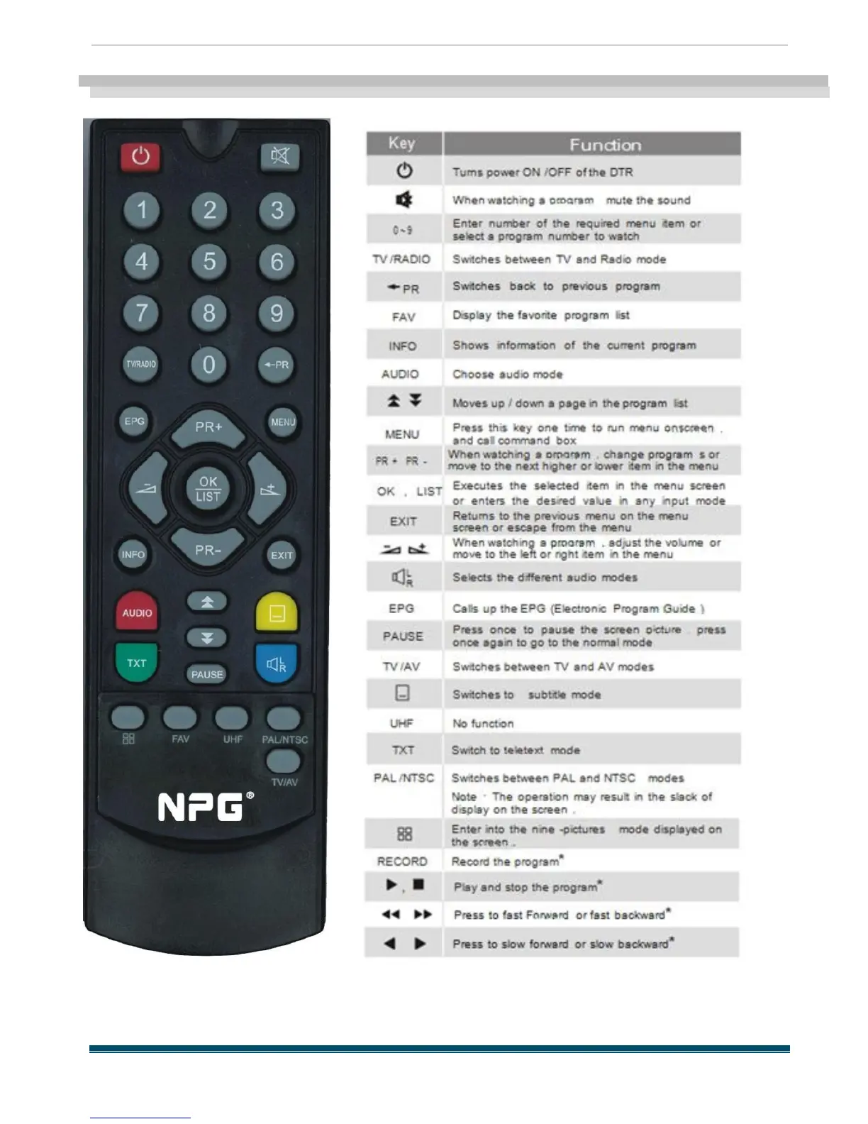 NPG DTR-126 - Remote Control Functions