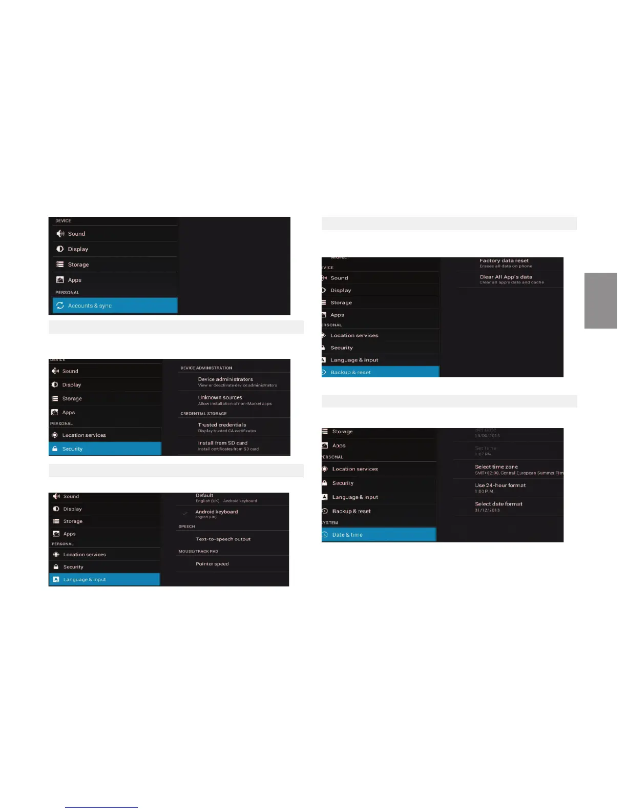 NPG NSD-3937HFB - Security Options; Language and Input Settings; Factory Reset Configuration