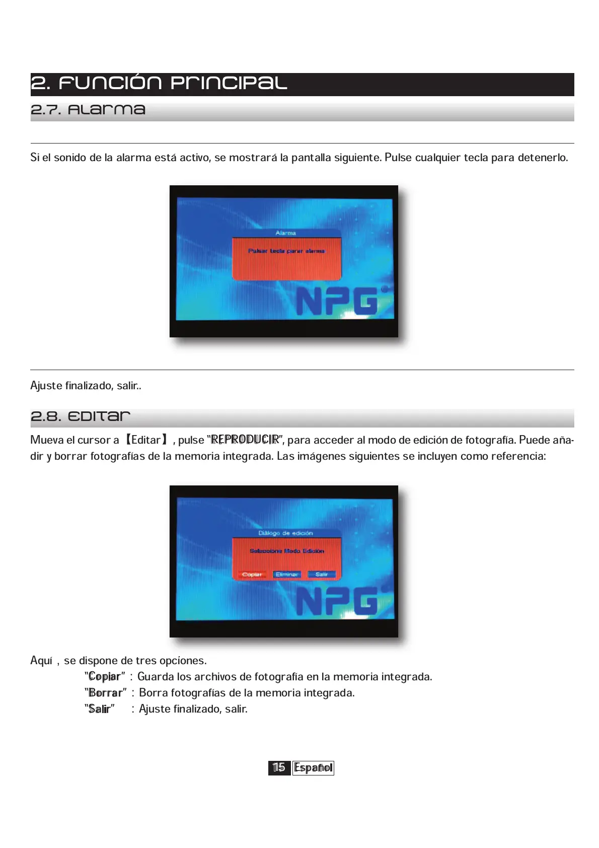 dir y borrar fotografías de la memoria integrada. Las imágenes siguientes se incluyen como referencia: