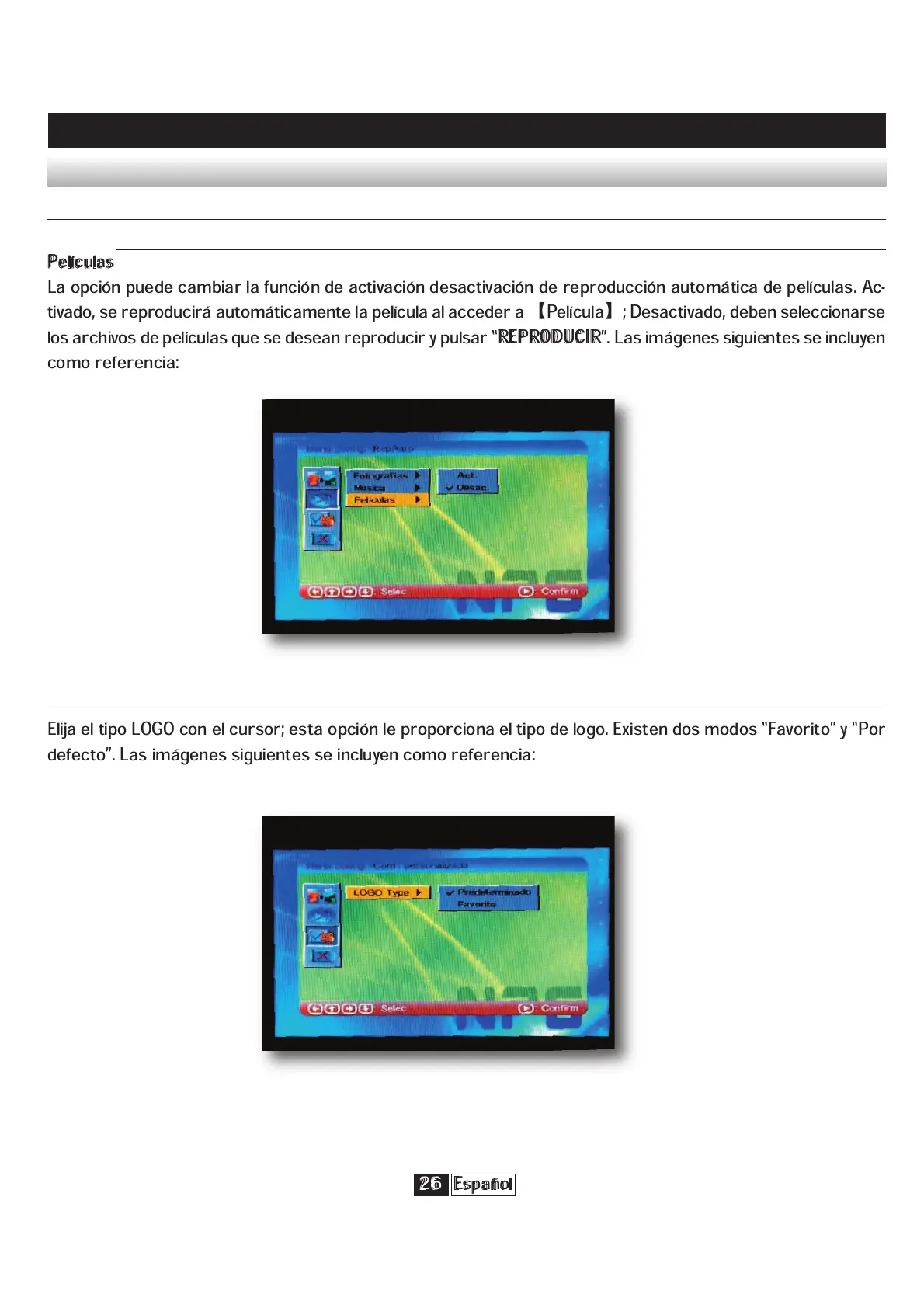 La opción puede cambiar la función de activación desactivación de reproducción automática de películas. Ac-