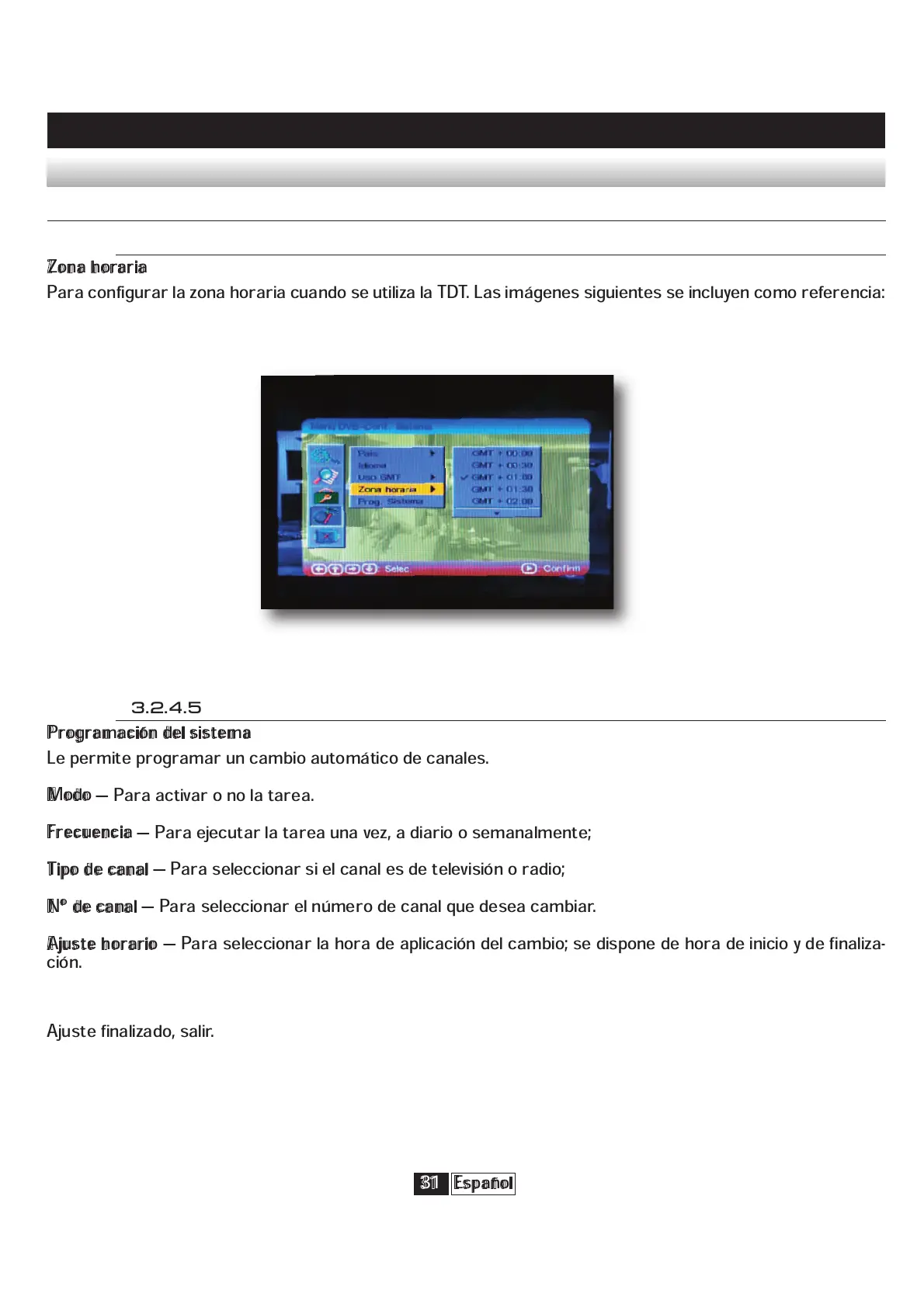 Para configurar la zona horaria cuando se utiliza la TDT. Las imágenes siguientes se incluyen como referencia: