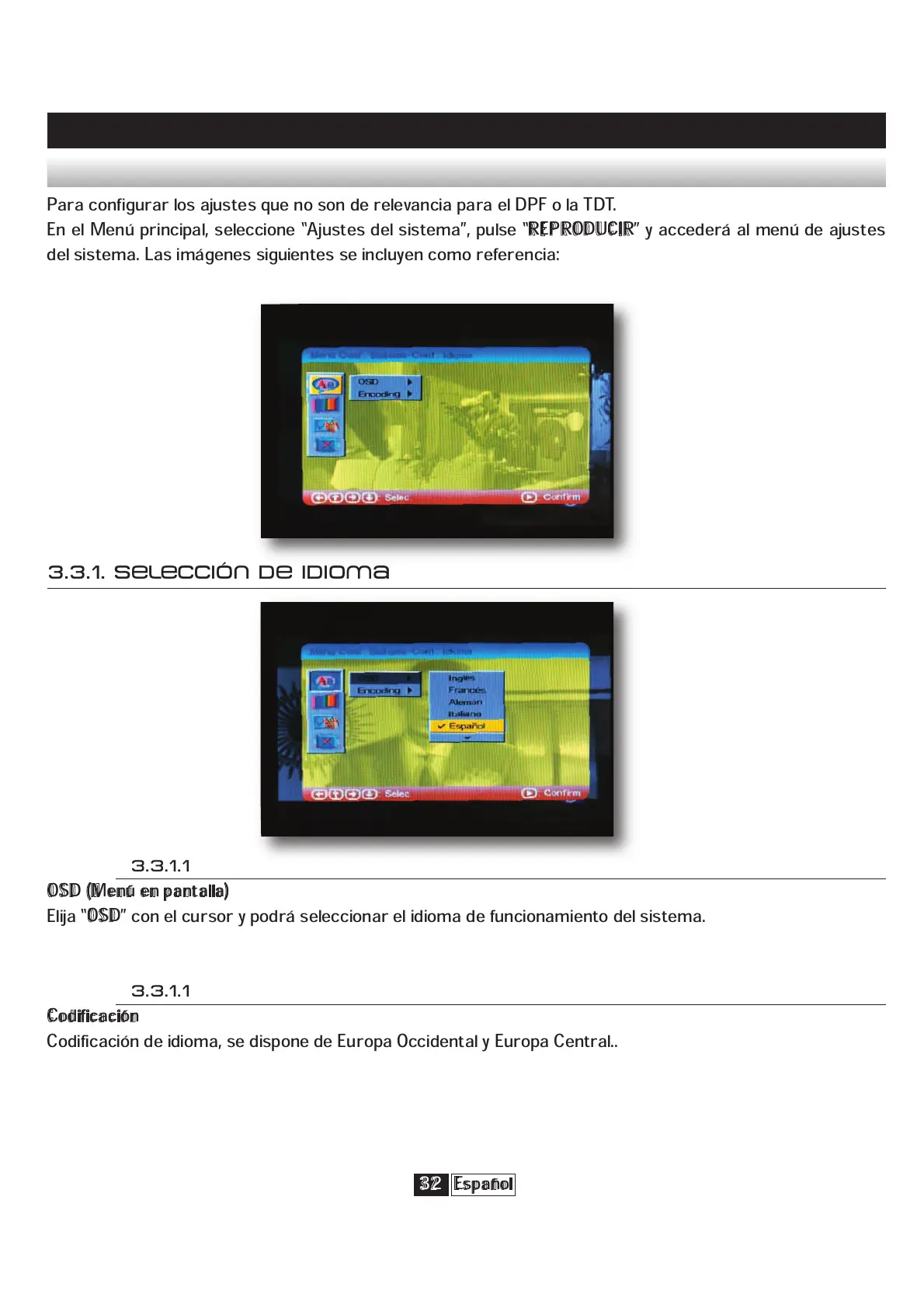 Codificación de idioma, se dispone de Europa Occidental y Europa Central..