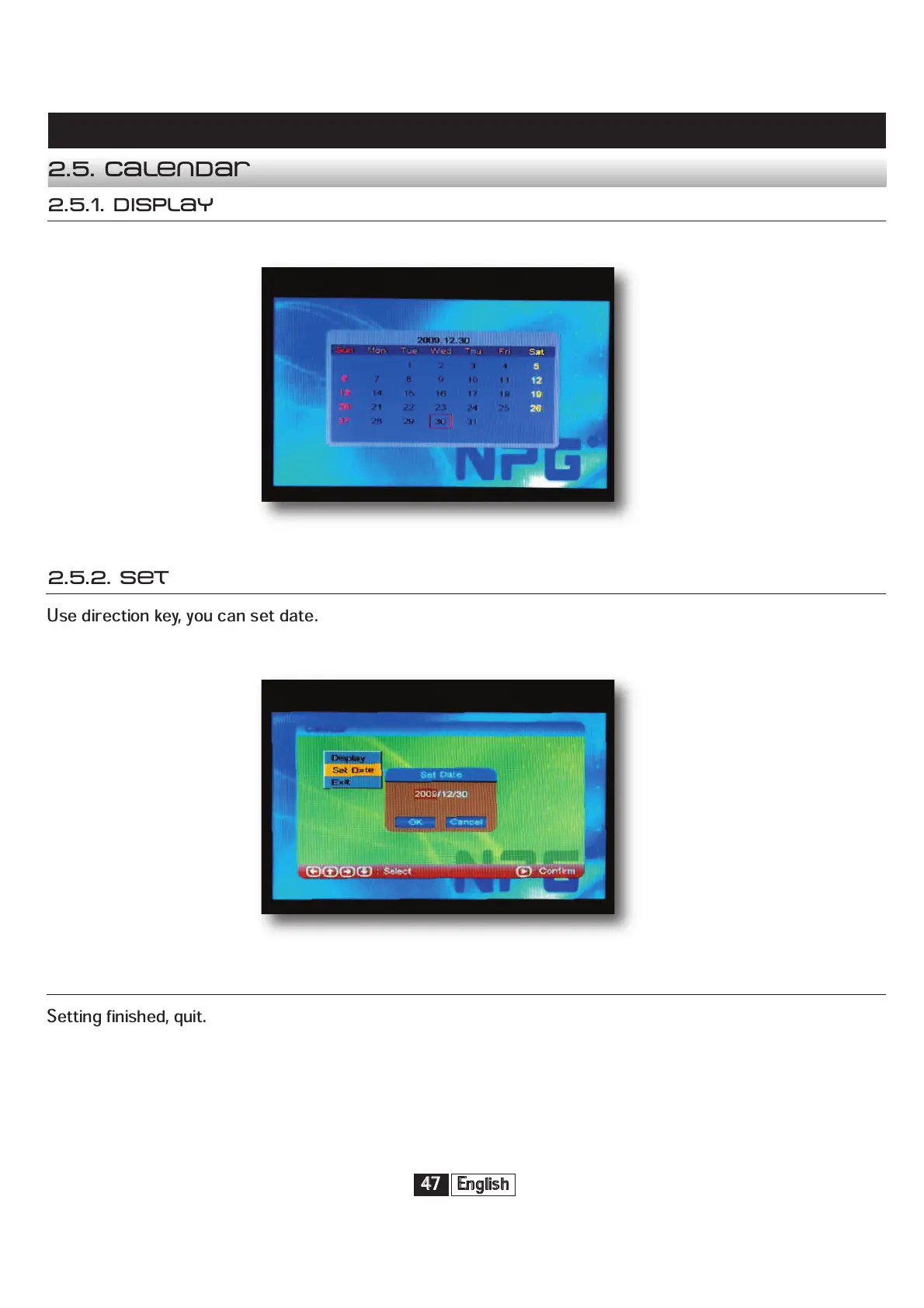 NPG PTF 700 ACB - 2.5.1. Calendar Display Mode; 2.5.2. Setting the Calendar Date; 2.5.3. Exiting Calendar