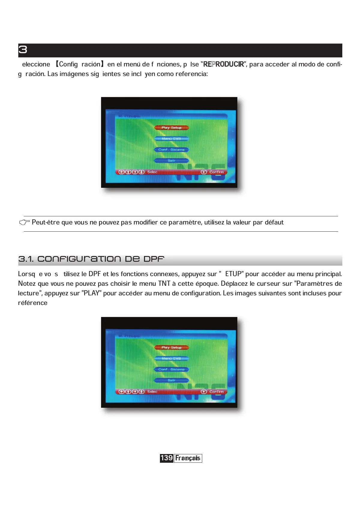 lecture", appuyez sur "PLAY" pour accéder au menu de configuration. Les images suivantes sont incluses pour