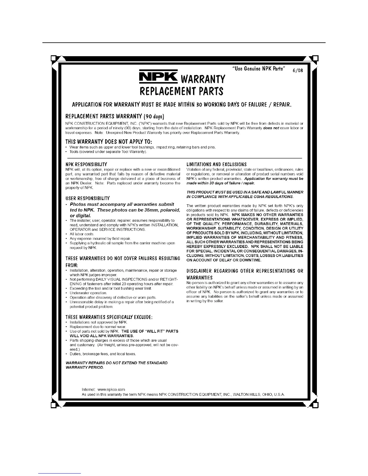 NPK GH12 - Replacement Parts Warranty; 90-Day Replacement Parts Warranty