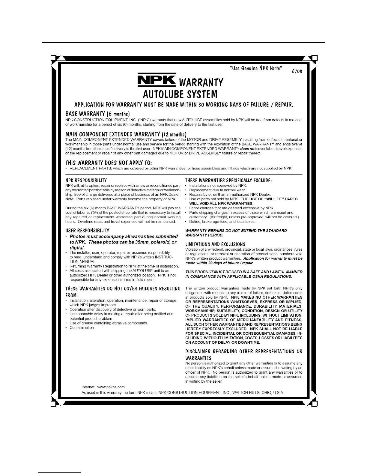 NPK GH12 - Autolube System Warranty; Autolube System Warranty Details