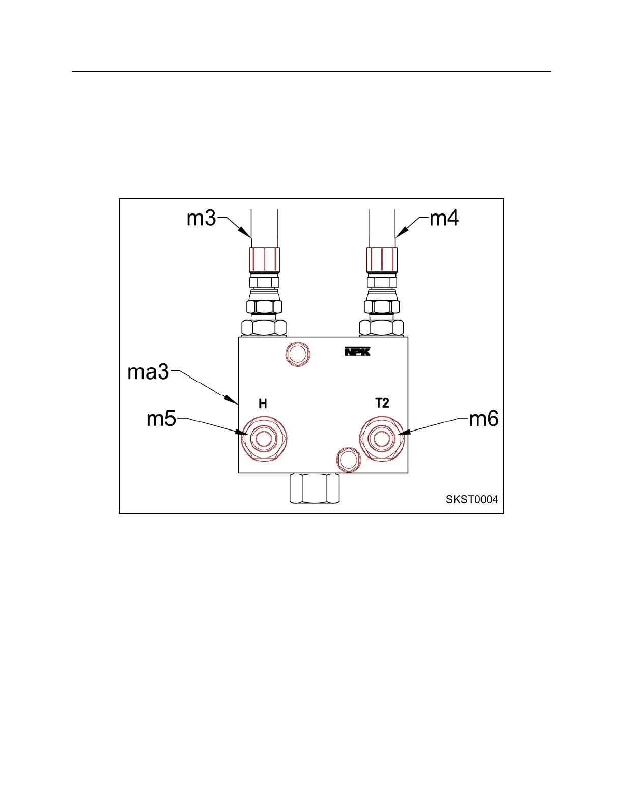 from valve port “H” (m5) connects to the “IN” port on the NPK hammer. The “OUT” port