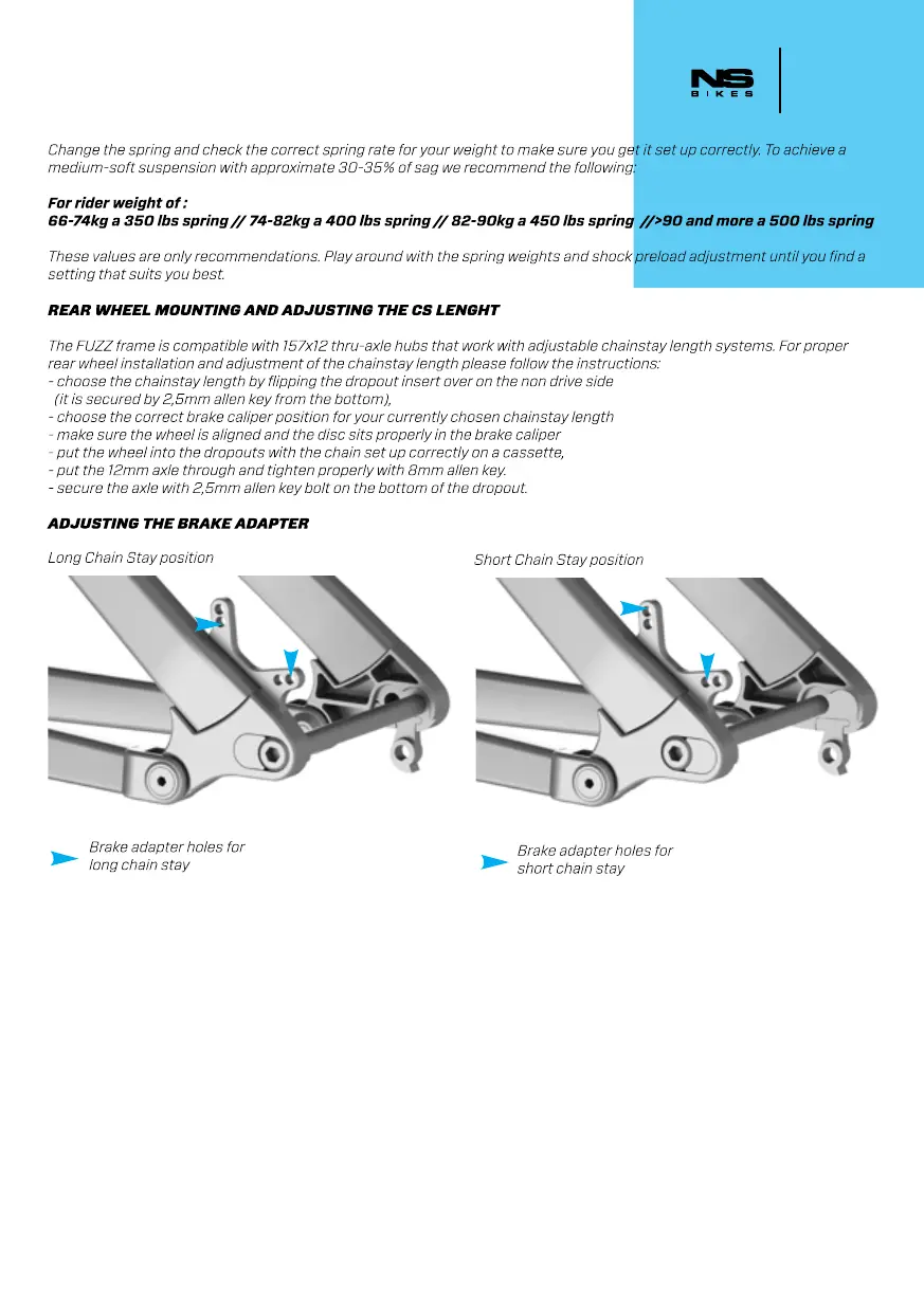 NS BIKES FUZZ - Rear Wheel and Chainstay Adjustment; Rear Wheel Mounting and CS Length; Brake Adapter Adjustment
