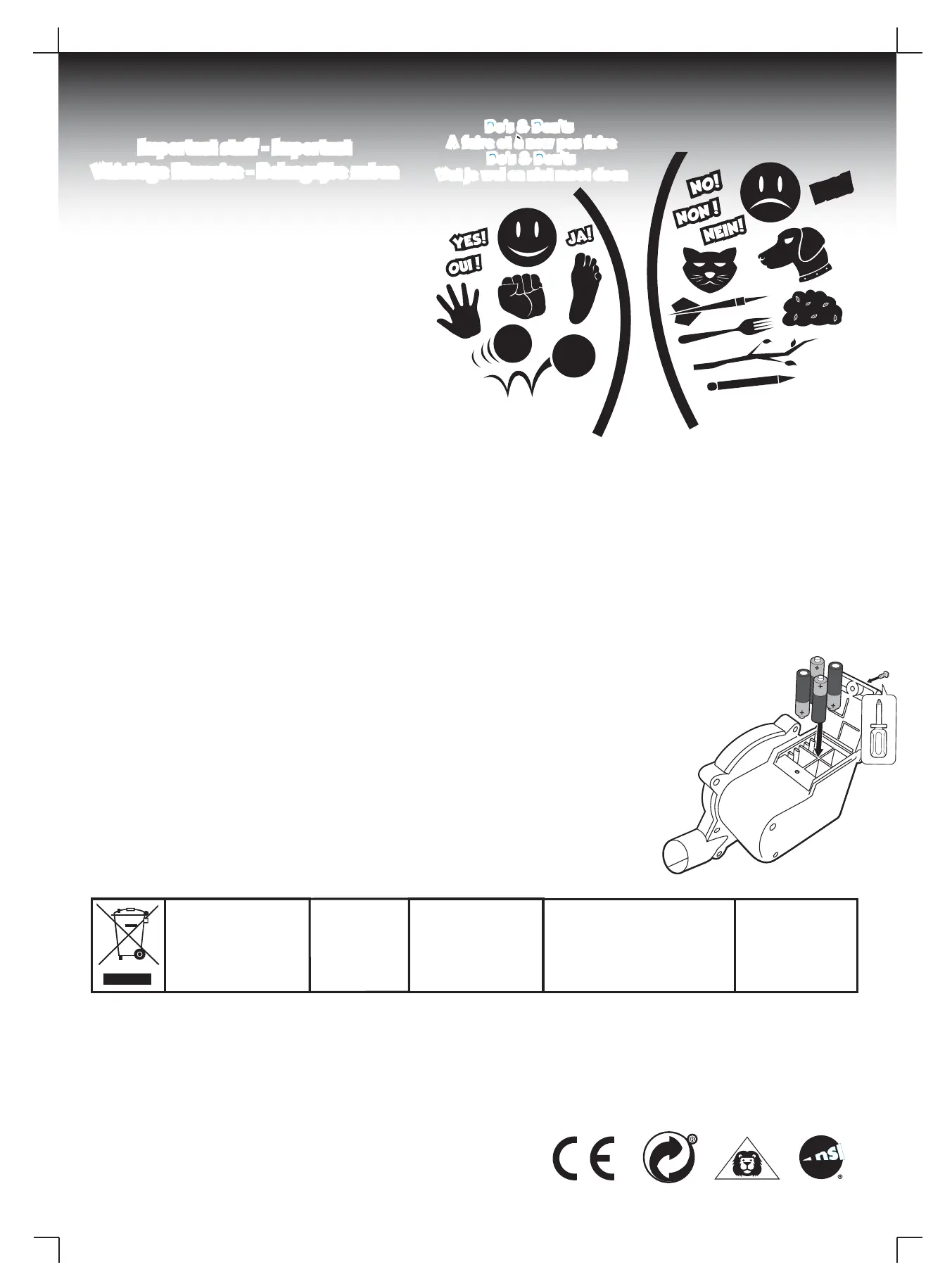 NL: INSTRUCTIES VOOR VERVANGEN VAN BATTERIJEN: Batterijen moeten worden vervangen door een volwassene zoals weergegeven in het