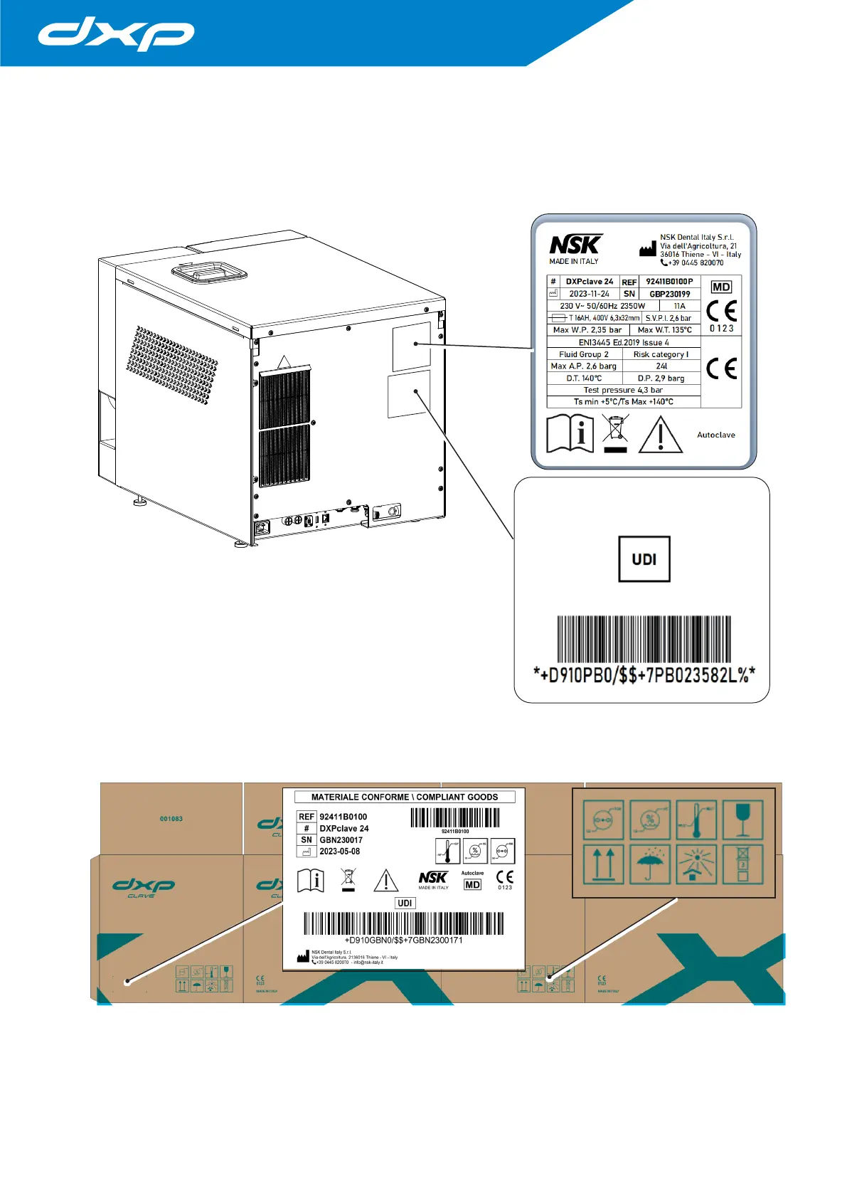 There are 2 labels which are fixed in the back of the sterilizer: the serial number label and the UDI label.
