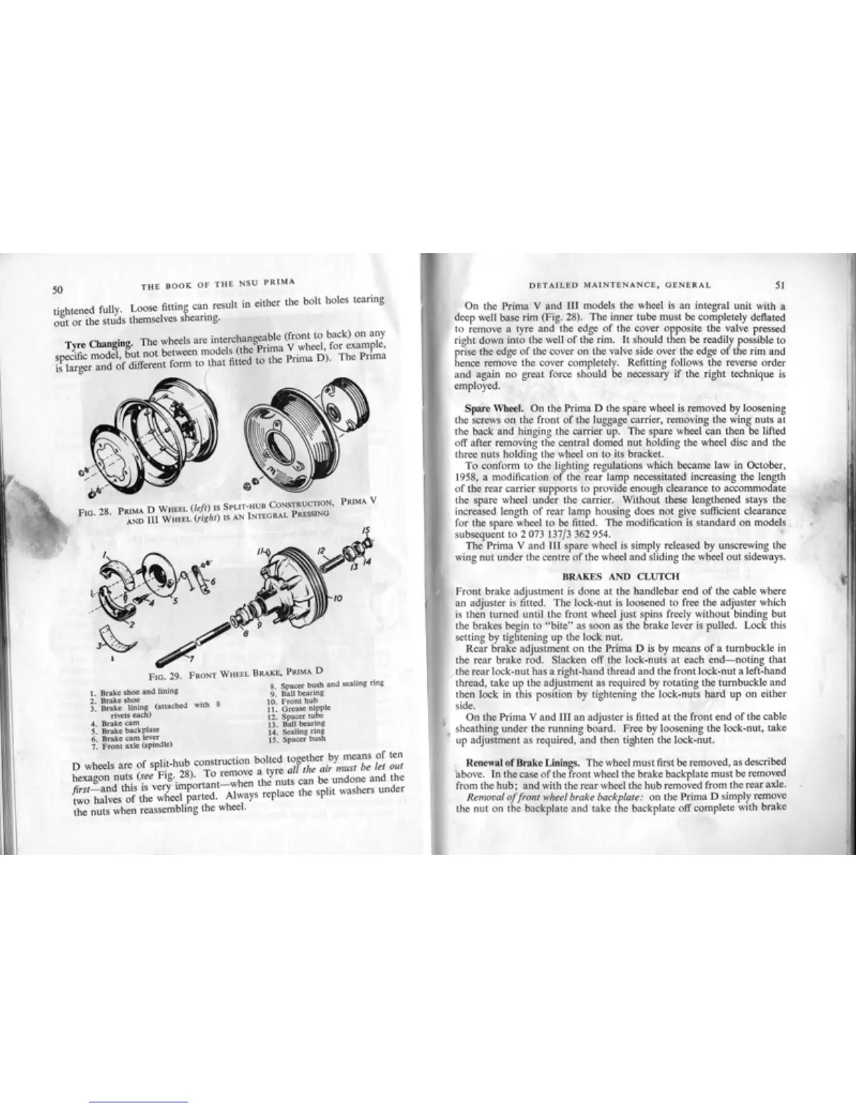 NSU Prima - Brakes and Clutch; Tyre Changing; Spare Wheel; Renewal of Brake Linings