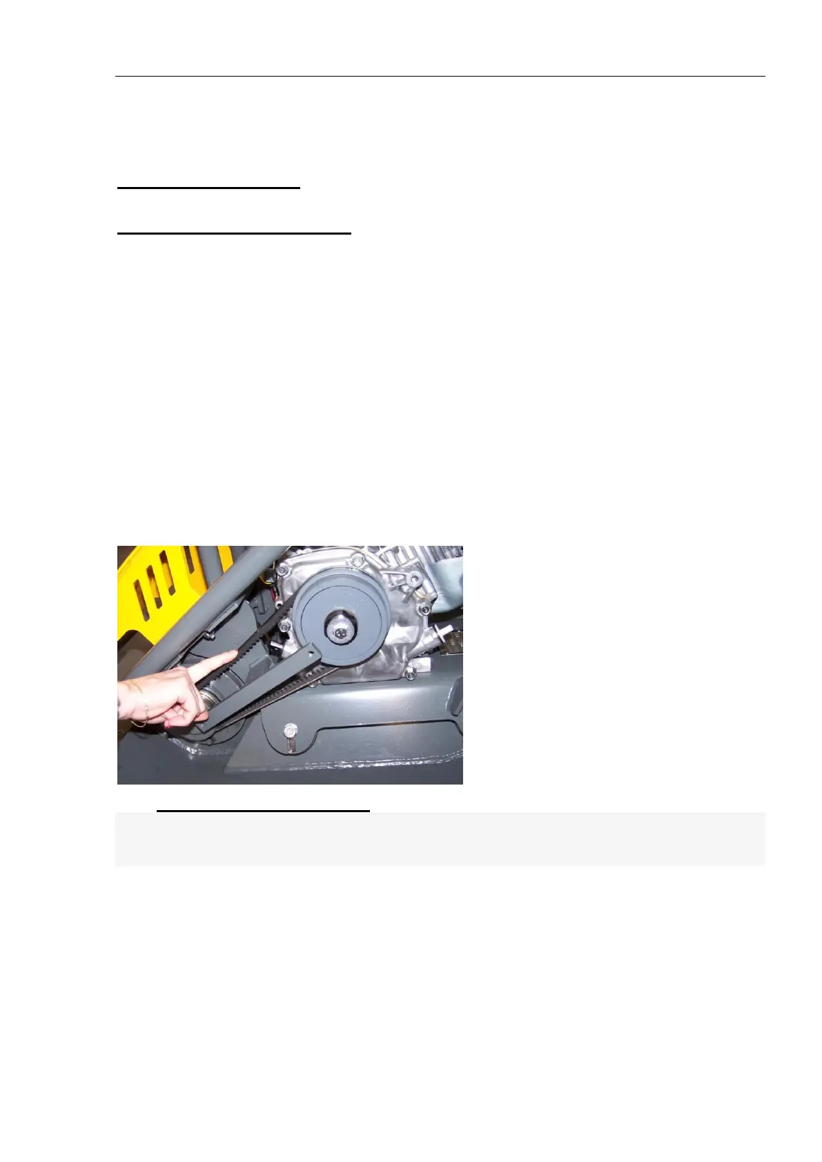 Inspect tensioning of the drive belt on a regular basis. Belt deflection should be about 10mm under finger