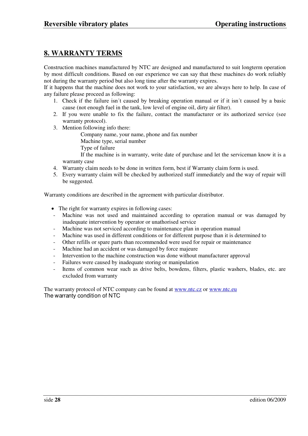 The warranty protocol of NTC company can be found at