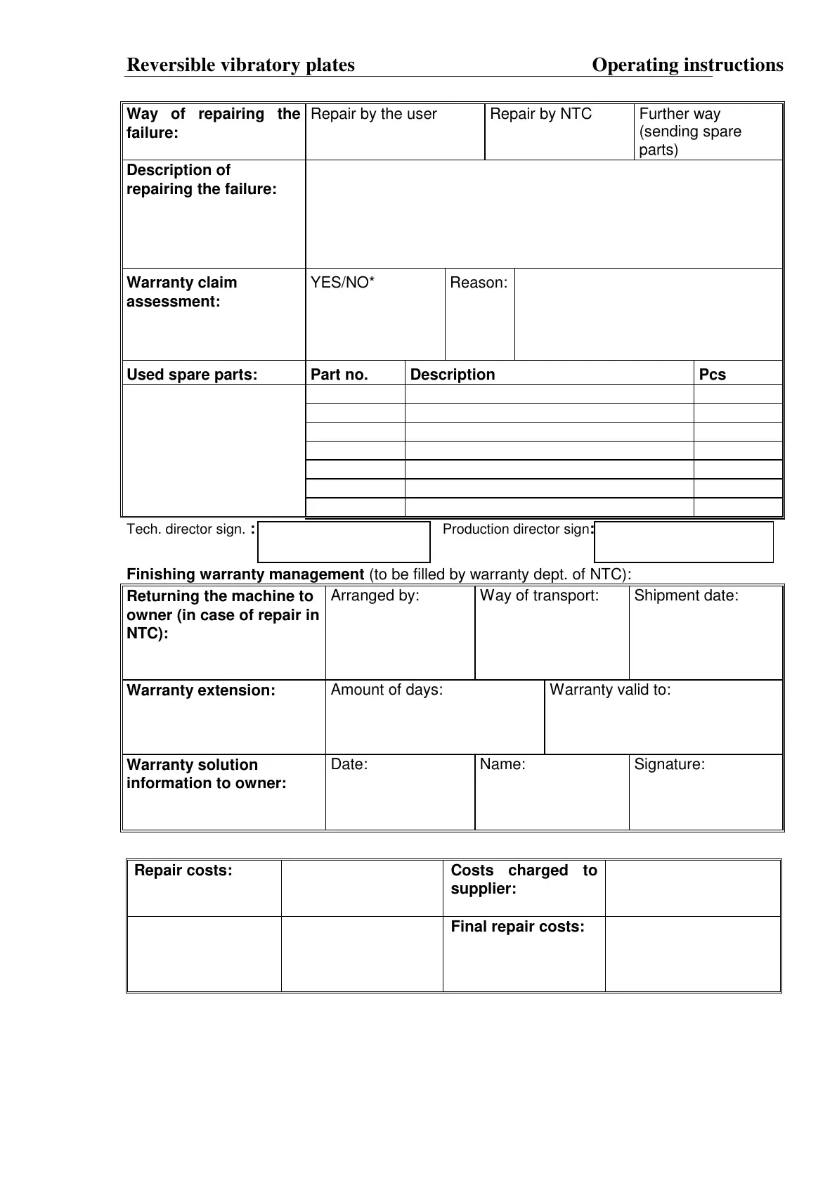 Finishing warranty management (to be filled by warranty dept. of NTC):