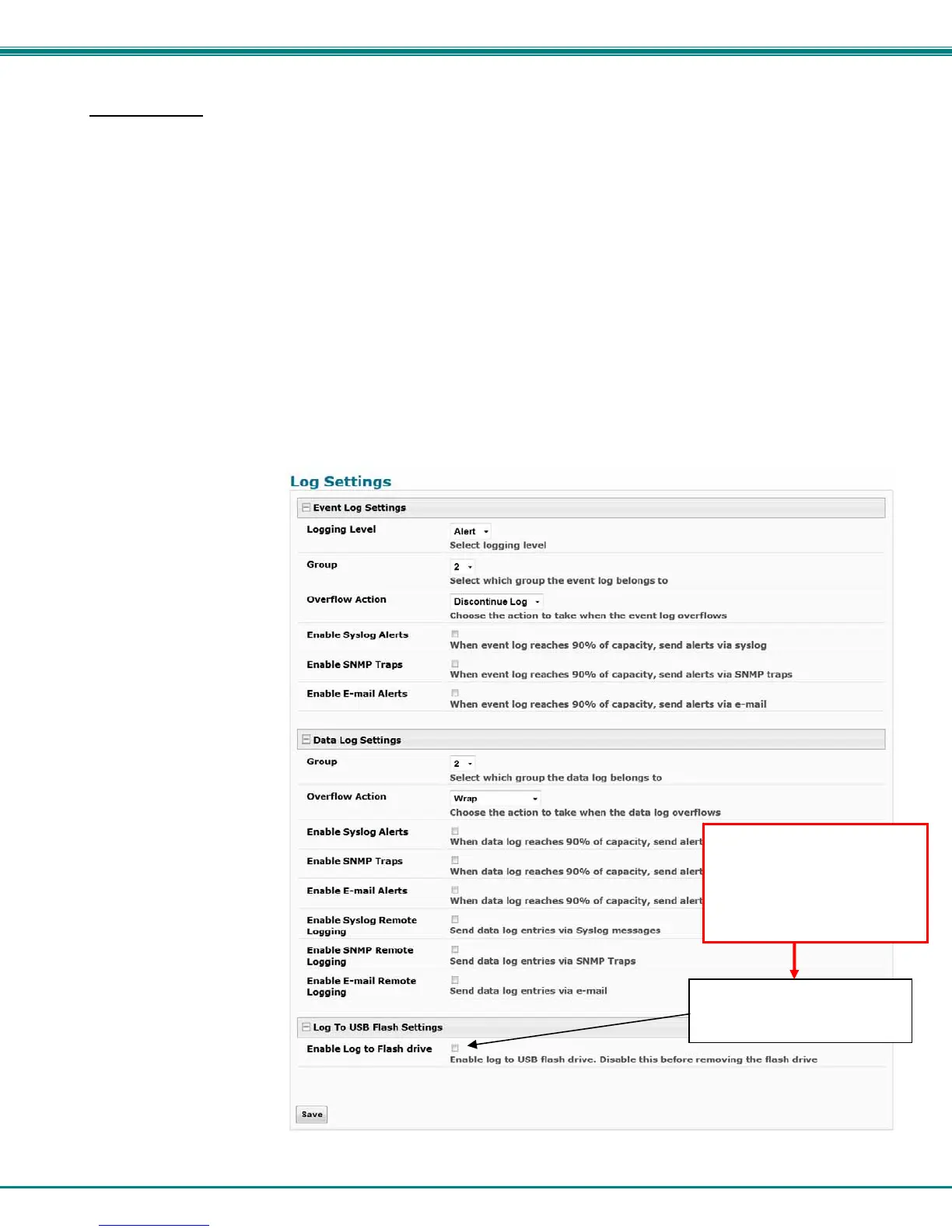 The Log Settings page (Figure 102) provides settings for how the ENVIROMUX will react when its Data and Event logs reach