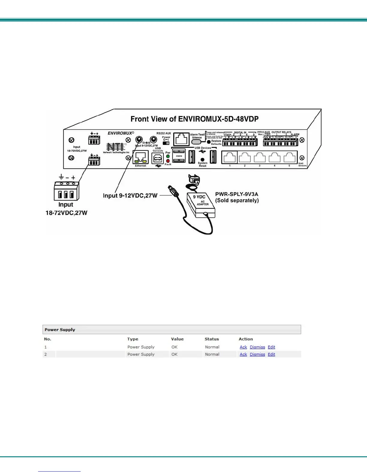 The 9-12VDC power connections will be ignored on the ENVIROMUX-5D-48V(DP) models.