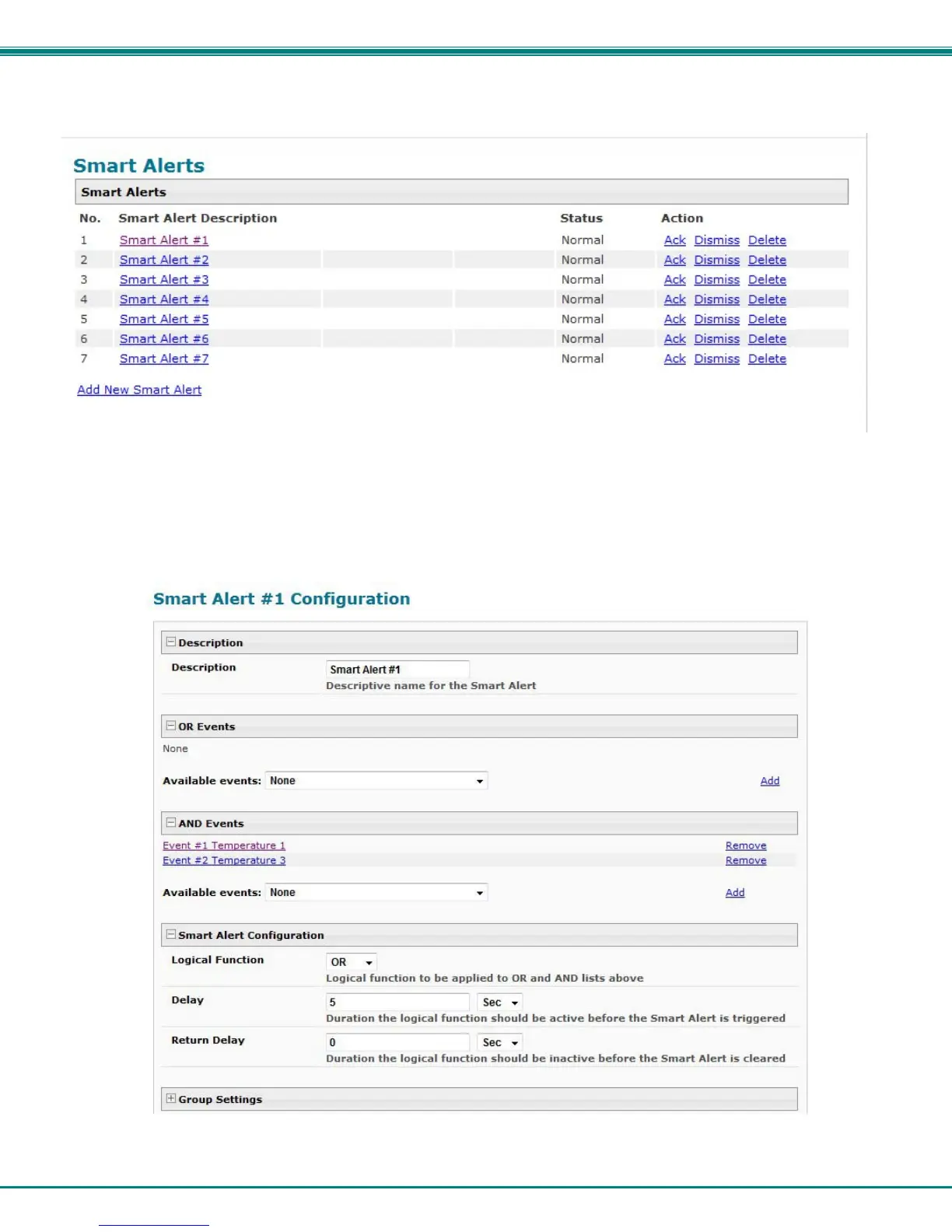 With Events defined, Smart Alerts (up to 20) can be configured to use Event combinations to send alert messages.