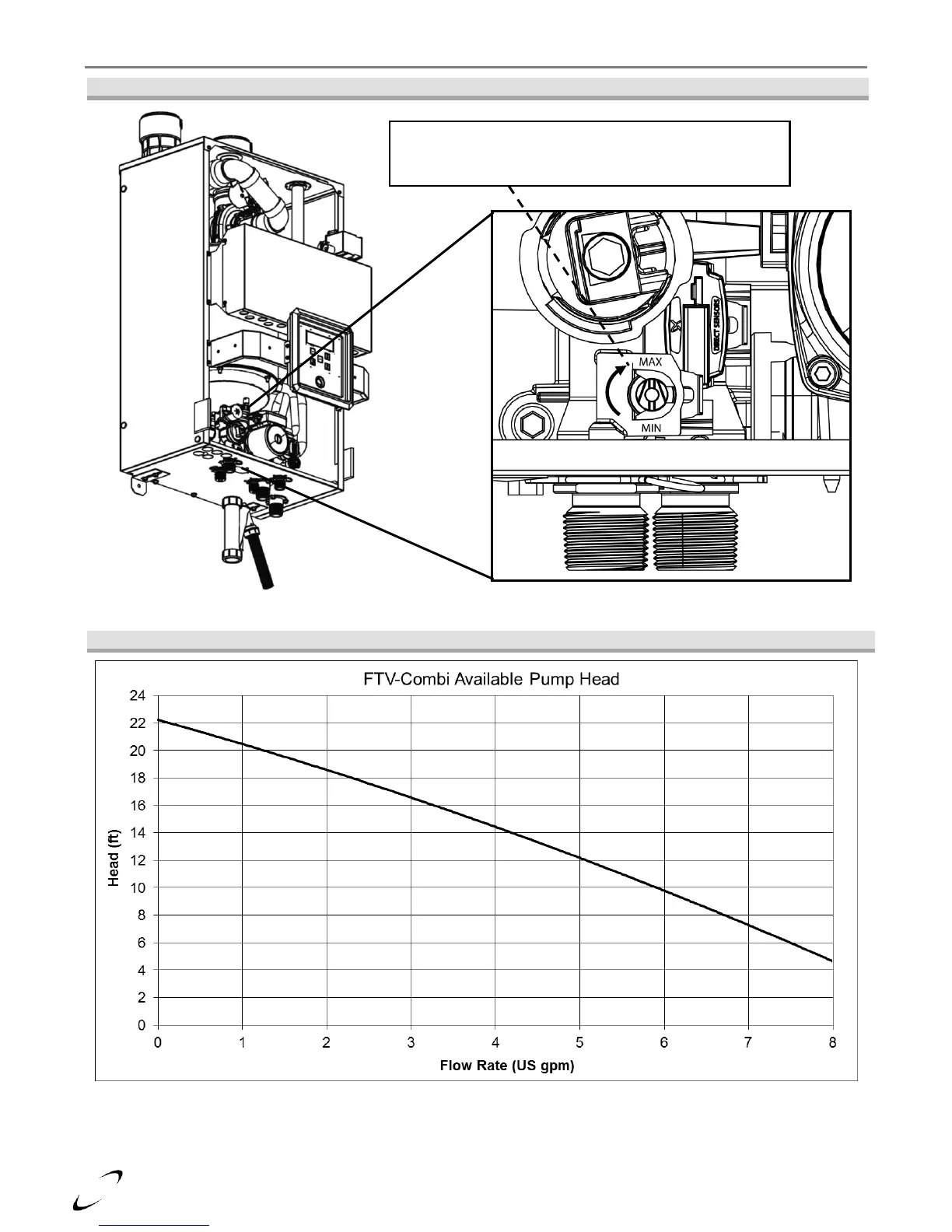Graph depicts available pump head of FTV-Combi internal pump, after boiler internal flow losses.