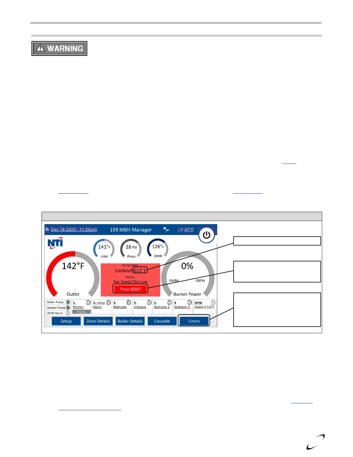 NOTE: for errors that require a manual reset, a “Press RESET” button will be located beneath the error description –