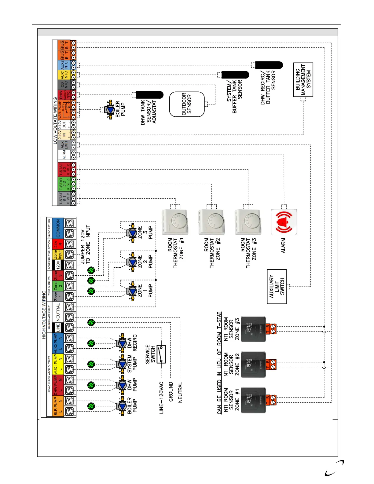 2. NTI Room Sensors can be used in place of convential room thermostats. Daisy-chain B & T of each sensor to BUS terminals B &