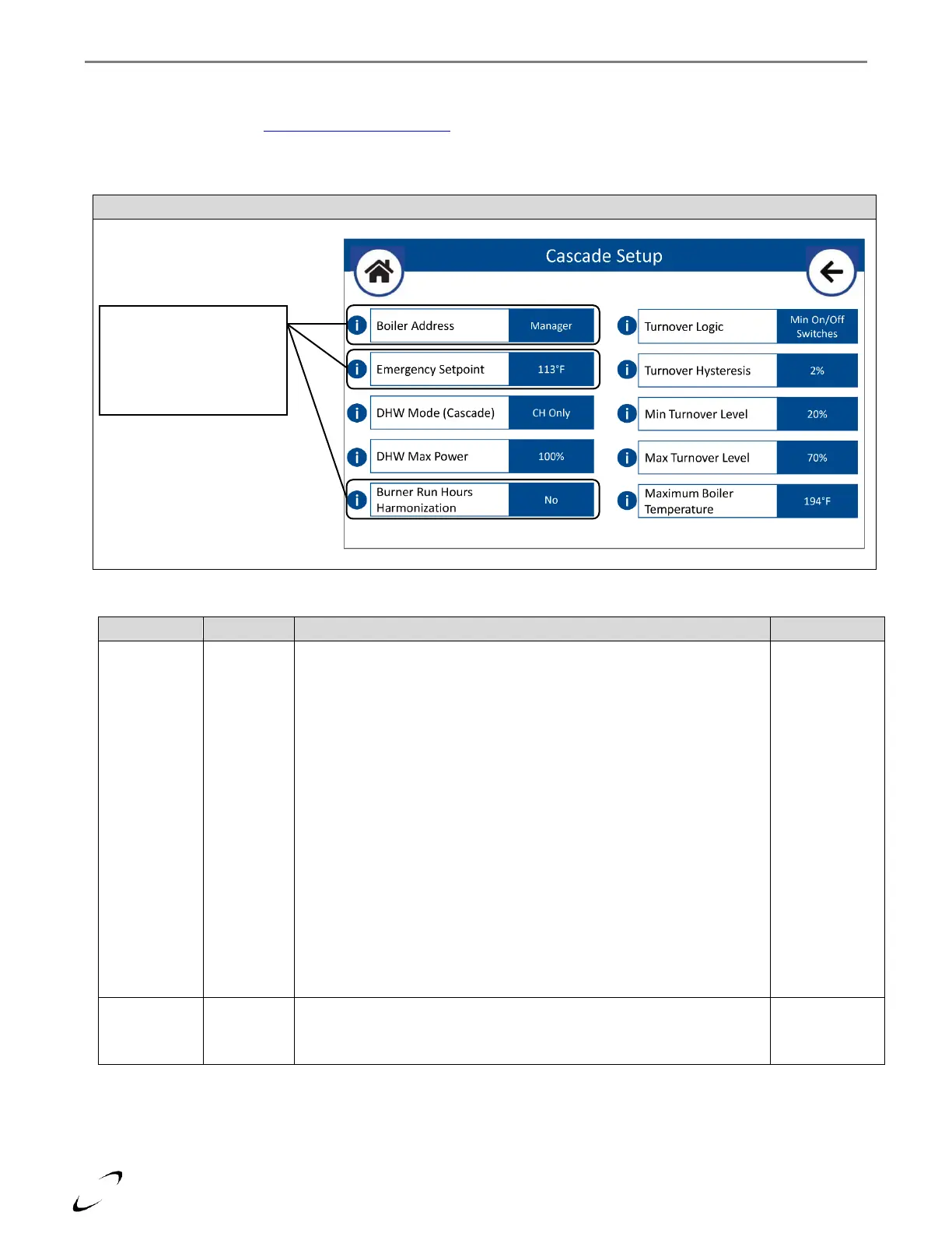 cascade, the Cascade Setup menu can be accessed to modify the Emergency Setpoint or Burner Run Hours Harmonization