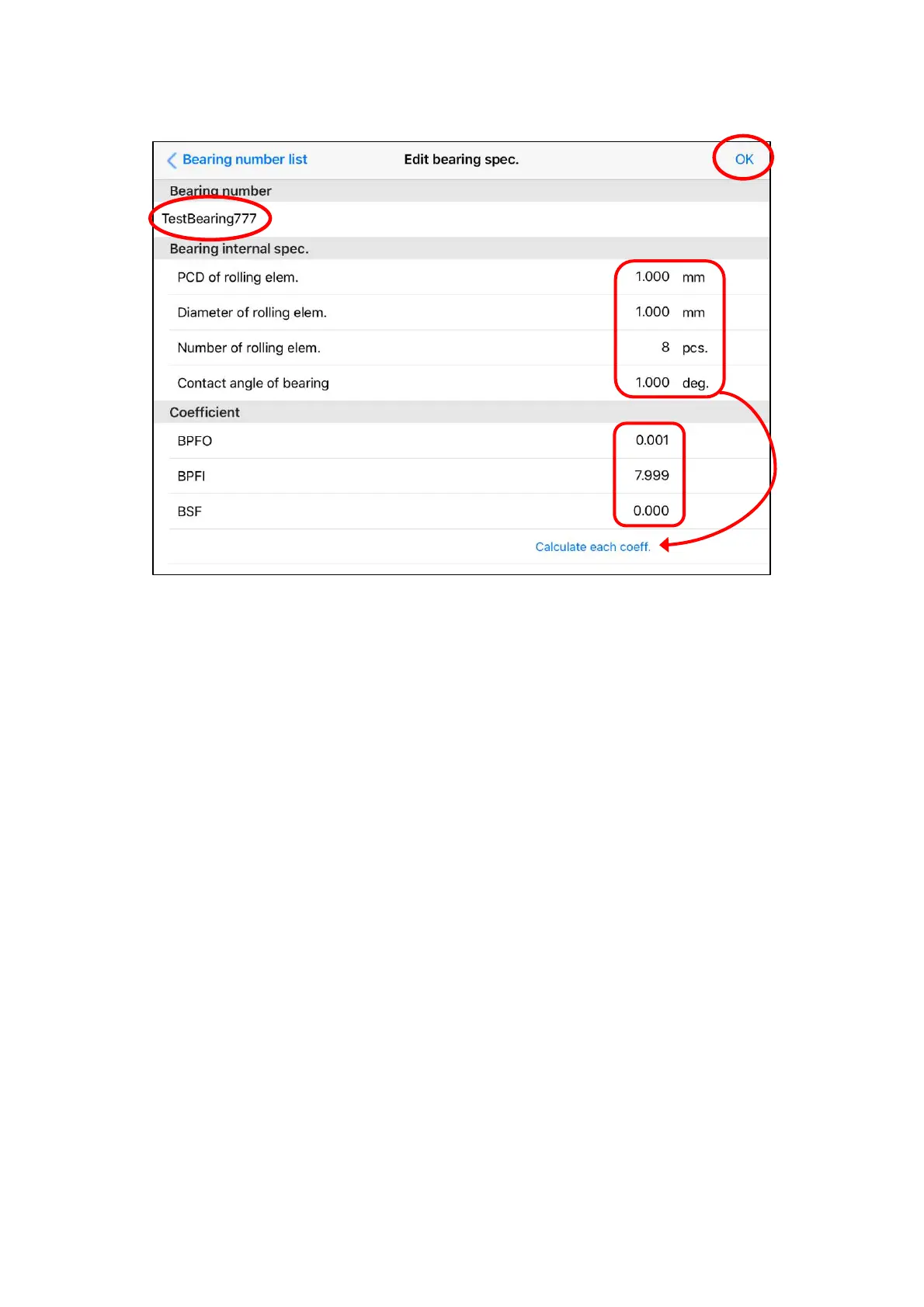 When bearing parameters are input, tap “Calculate each coeff.” and obtain the coefficients without fail.