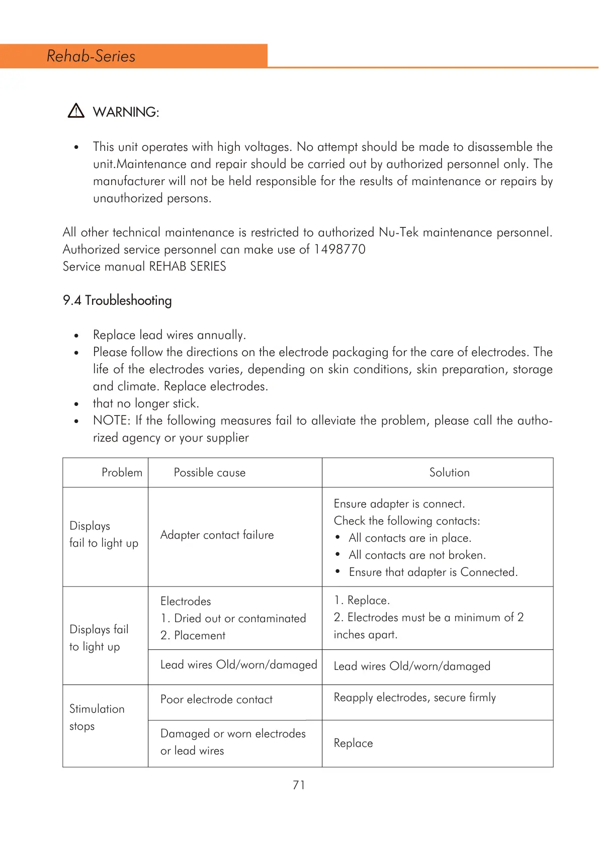 All other technical maintenance is restricted to authorized Nu-Tek maintenance personnel.