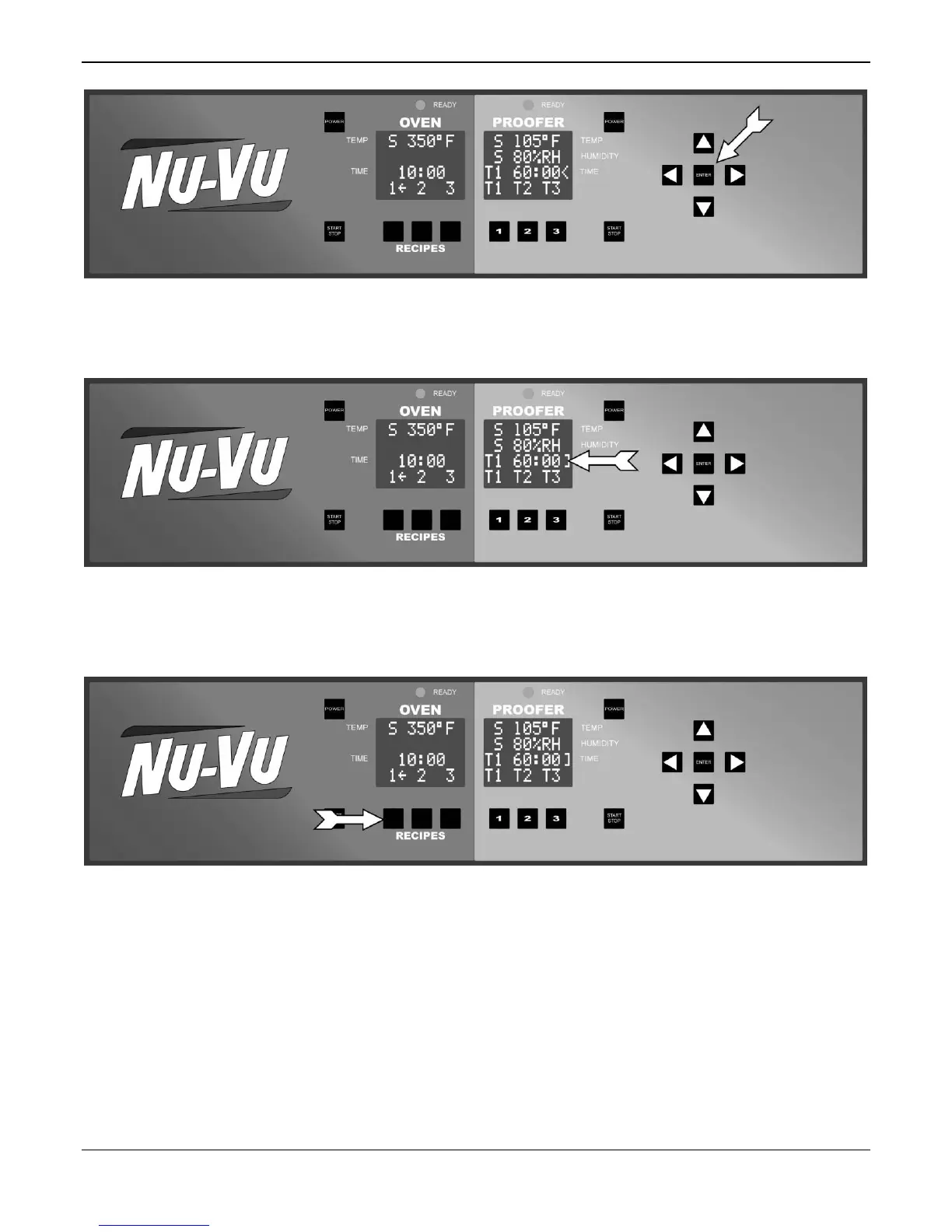 The controller uses one-touch recipe recall using the buttons located below the oven and proofer displays. A recipe can
