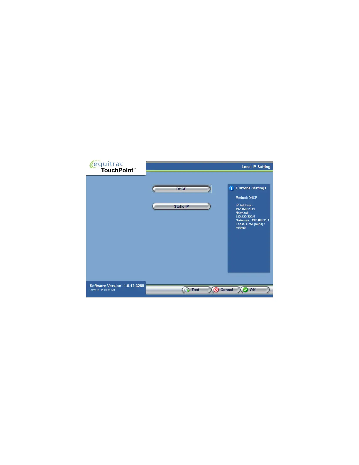 Press DHCP, then click Test. Clicking Test tells TPC to contact the DHCP server for an IP Address. The Current