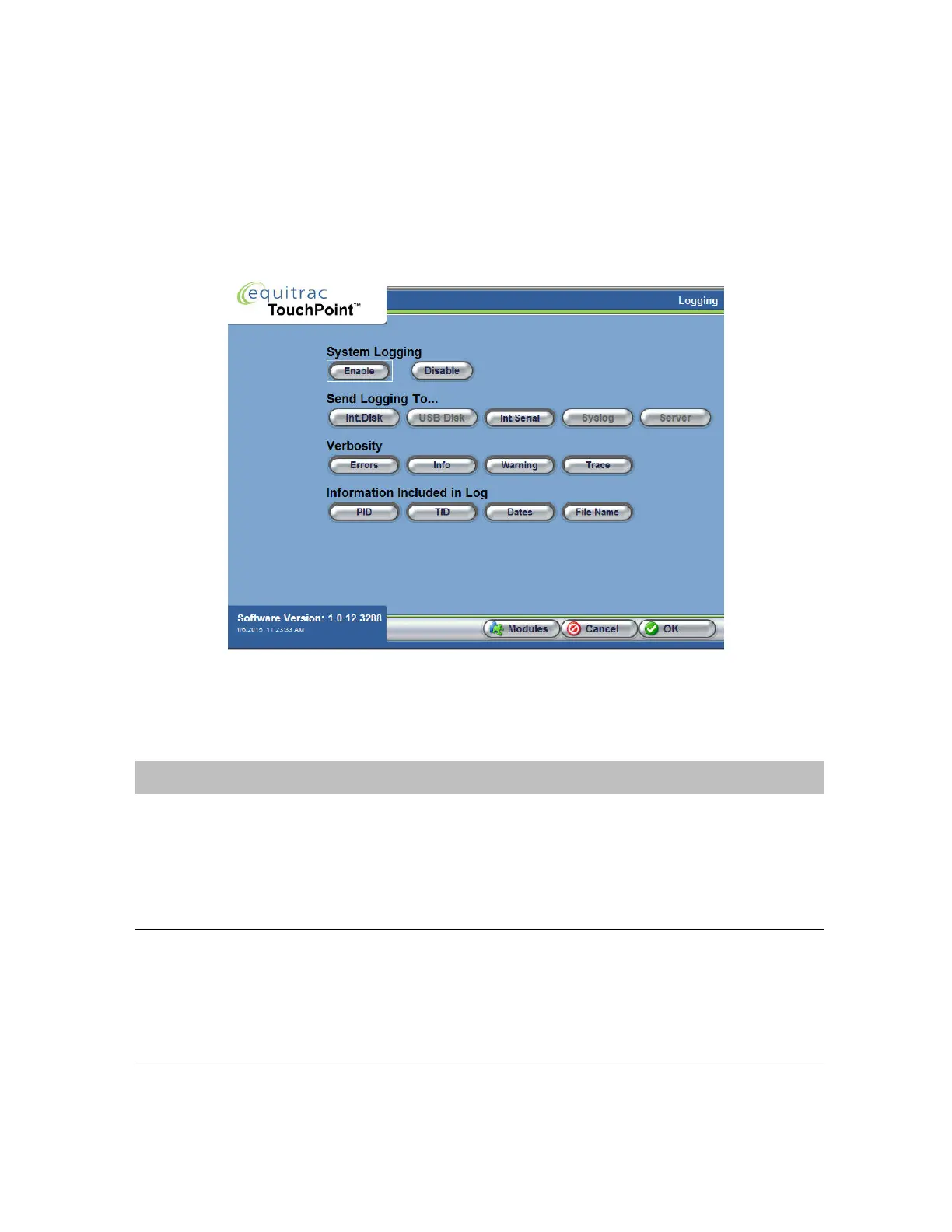 trace the source of a problem. The Logging screen allows you to enable or disable logging, determine where the log