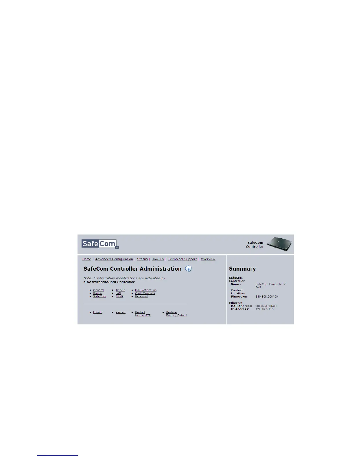 SafeCom Controller opening page. If the page is password-protected you will be