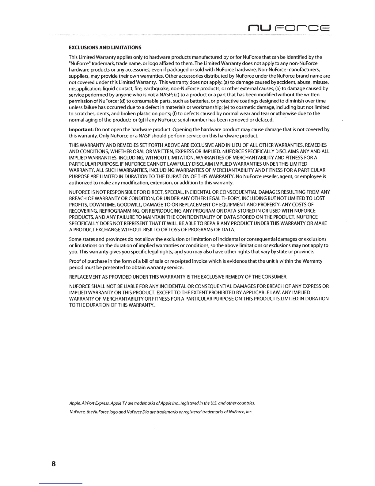 misapplication, liquid contact, fire, earthquake, non-NuForce products,