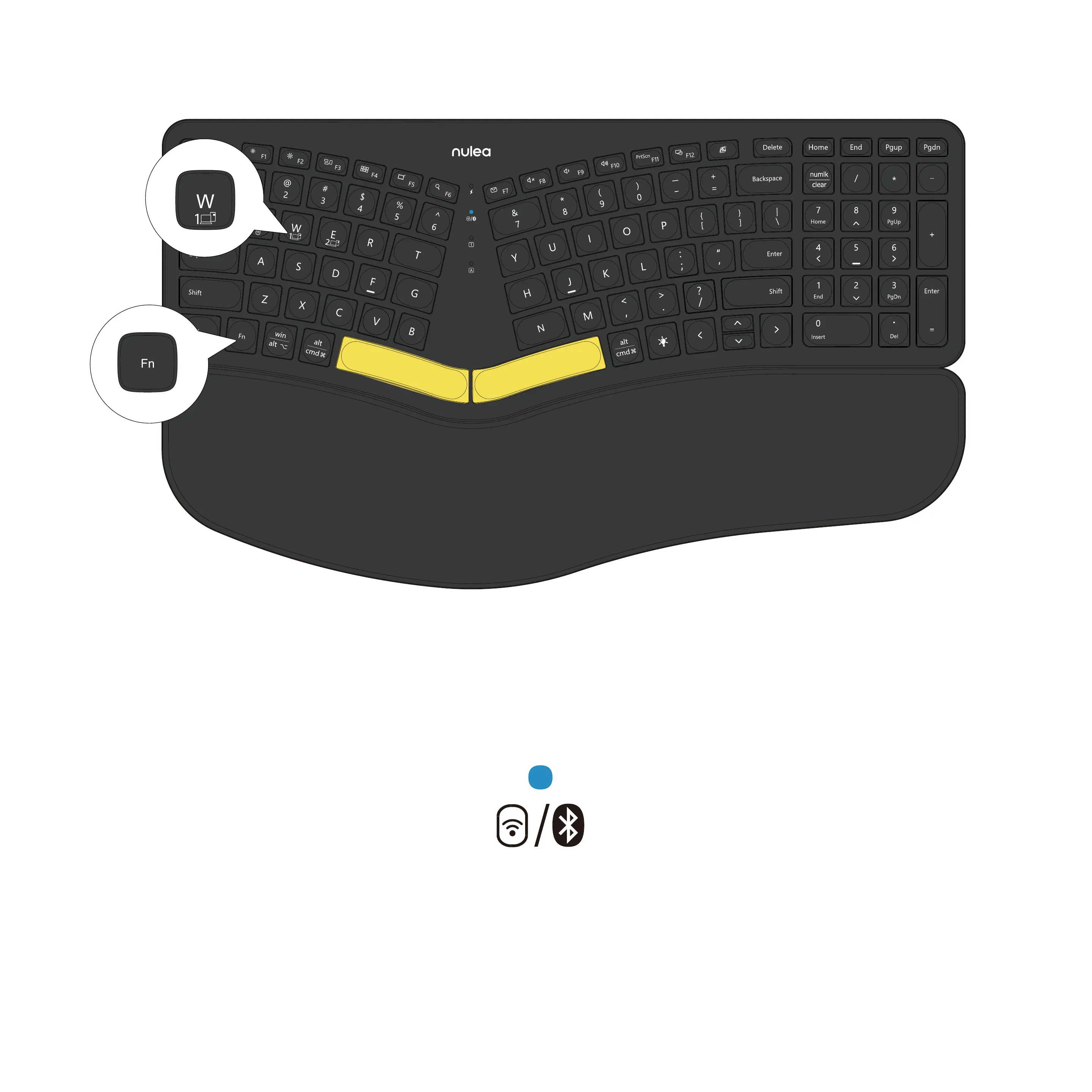 Long press “Fn+W” for 5 seconds to enter pairing mode, Bluetooth channel 1