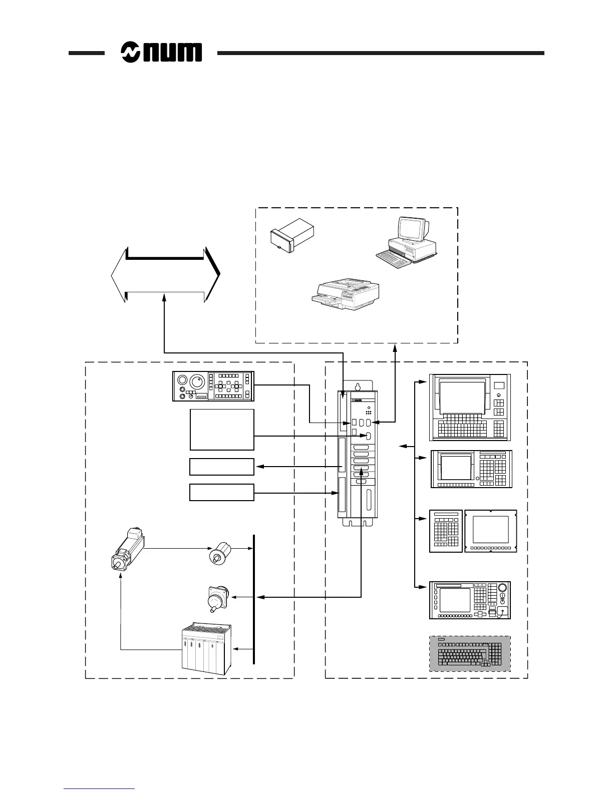 The following diagram illustrates the links between the CNC, the machine and the peripherals for a NUM 1020, 1040