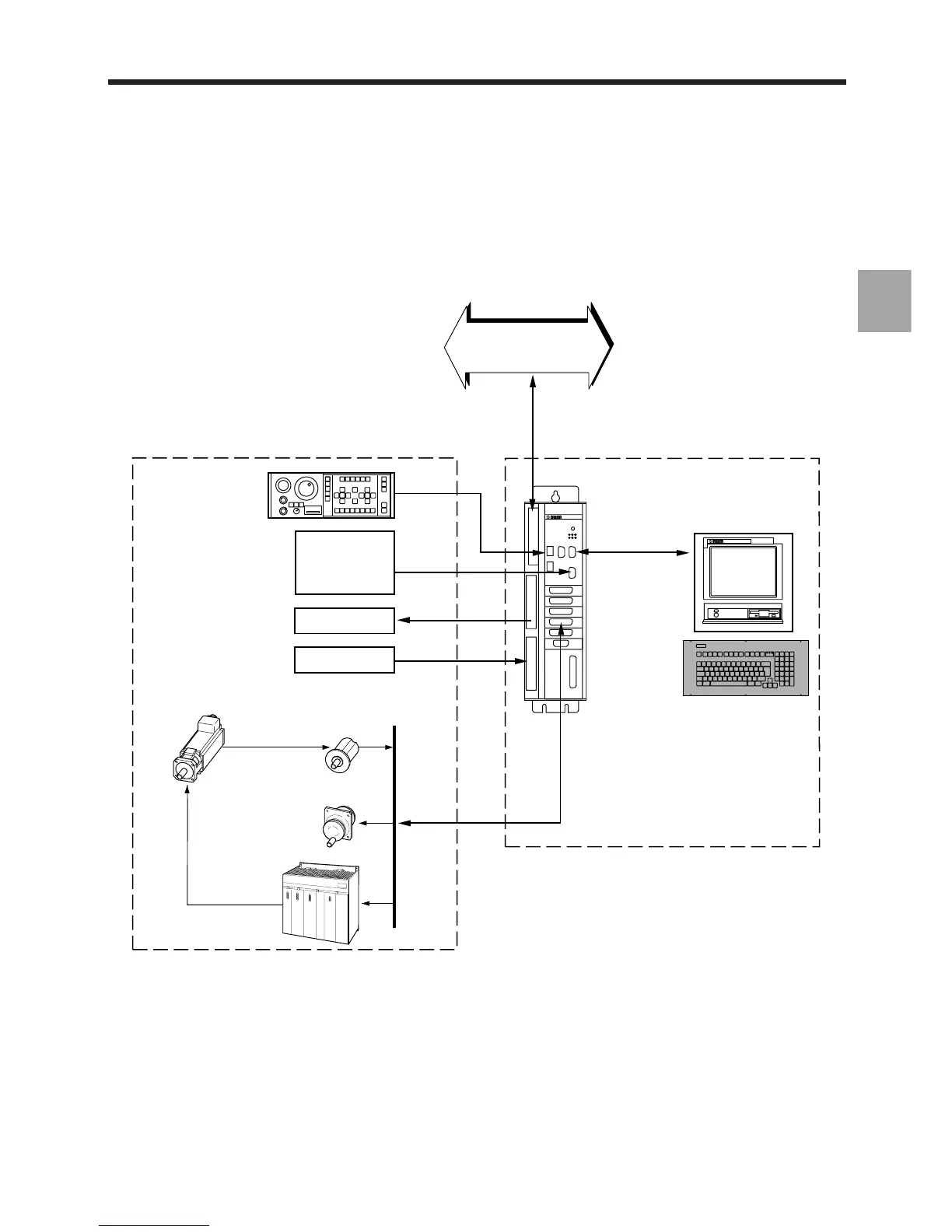 The following diagram illustrates the links between the CNC, the machine and the peripherals for a NUM 1020, 1040