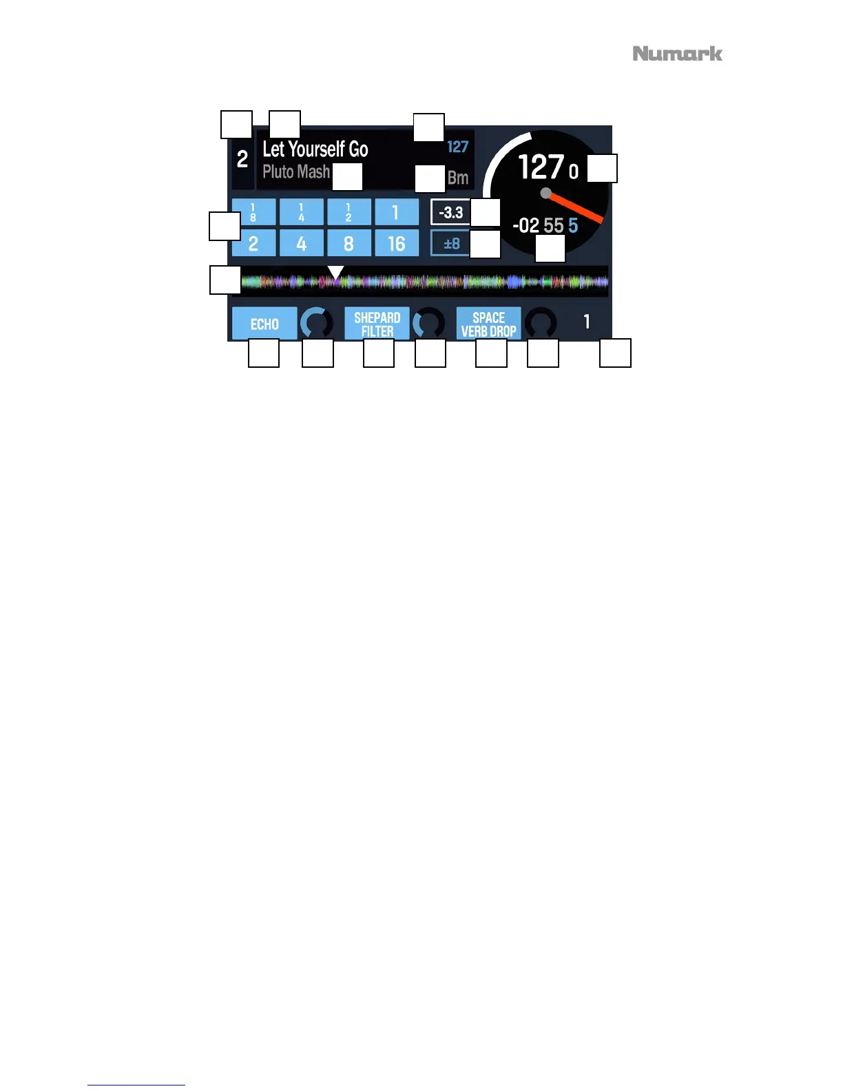 10. Panoramica della traccia: indica l’onda della traccia attualmente caricata, che segue una