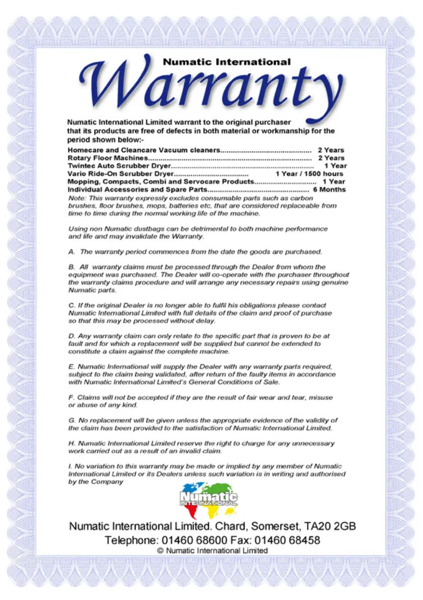 Numatic GVE 370 - Numatic International Warranty; Warranty Policy and Claims
