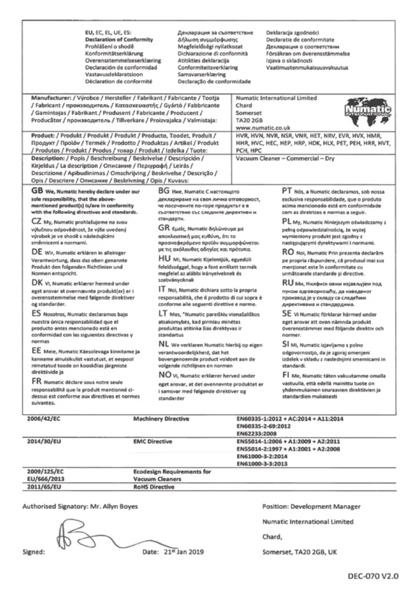 Numatic Henry 160 - Declaration of Conformity; Product Compliance Information