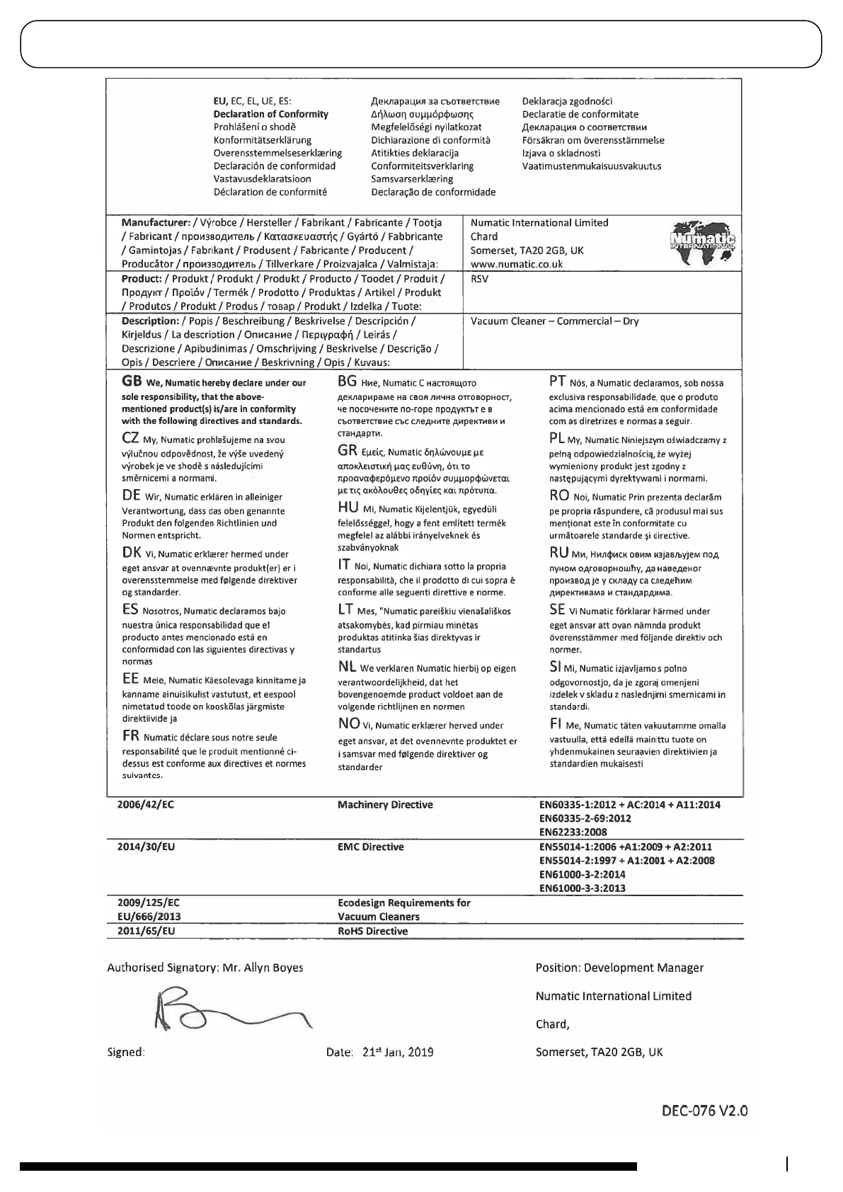 Numatic RSV150 - Declaration of Conformity