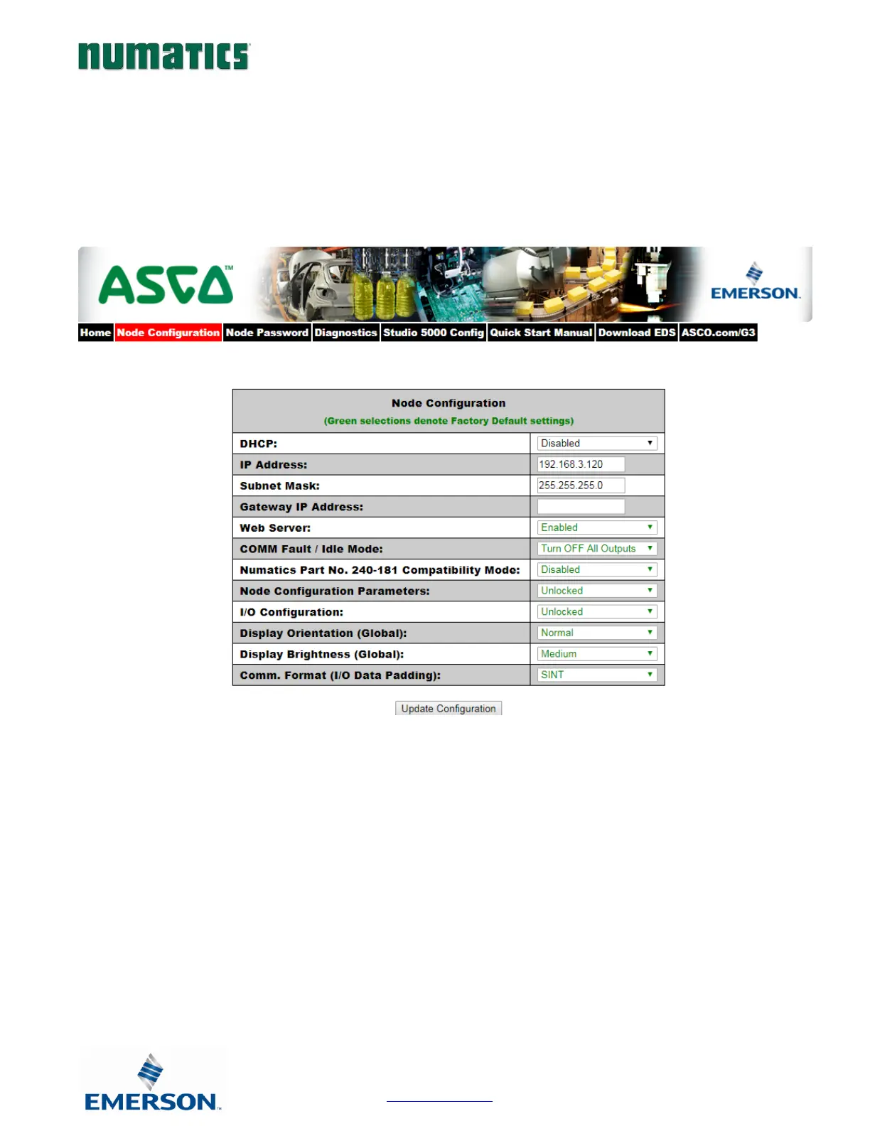 The “Node Configuration” window can be used to control different parameters within the manifold. These parameters include,
