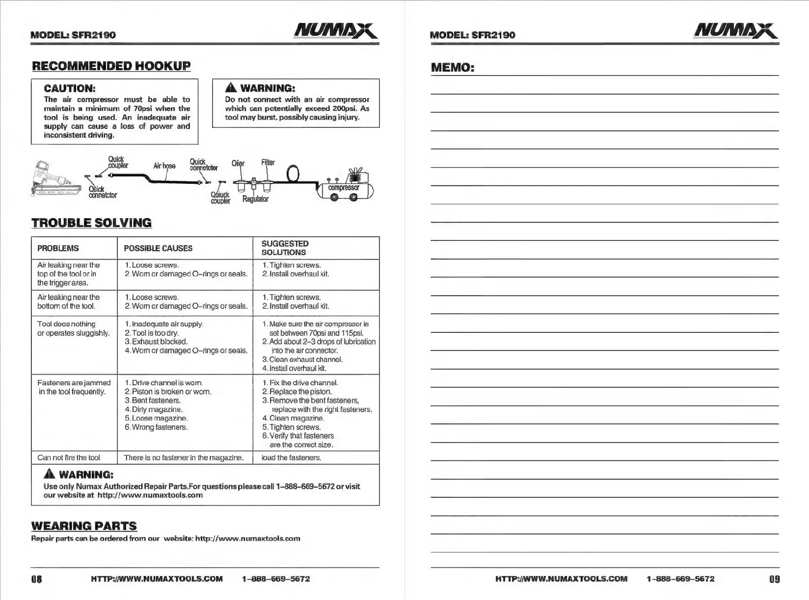 Numax SFR2190 - Recommended Hookup; Trouble Solving; Wearing Parts