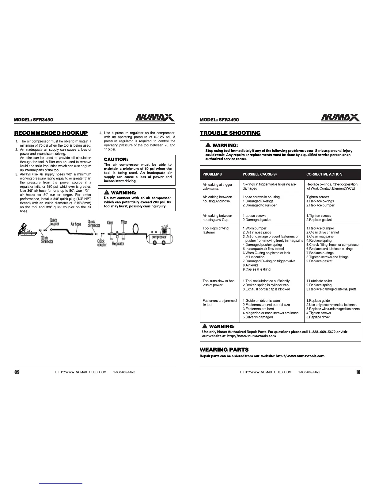 Numax SFR3490 - Recommended Hookup and Troubleshooting; Recommended Air Supply Hookup; Trouble Shooting Guide