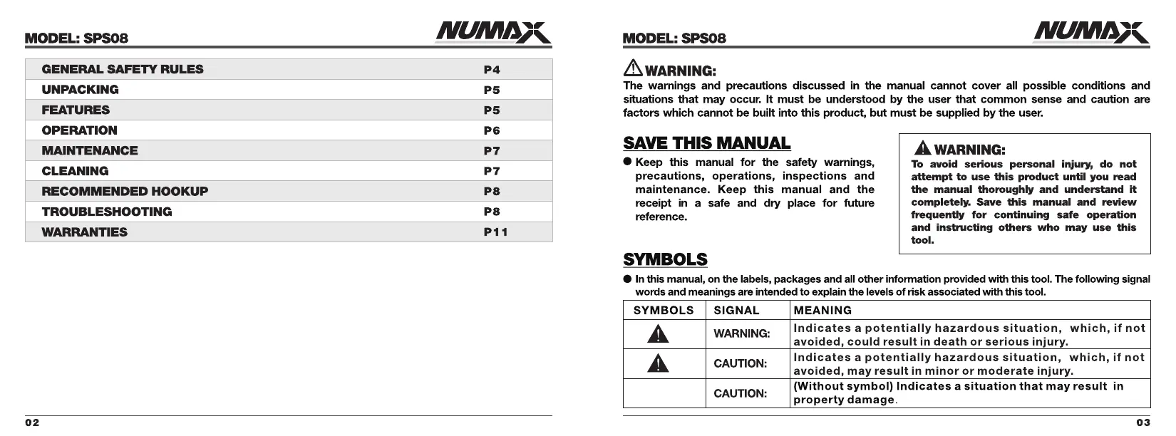 Numax SPS08 - Symbols and Meanings; Warning Symbol; Caution Symbol