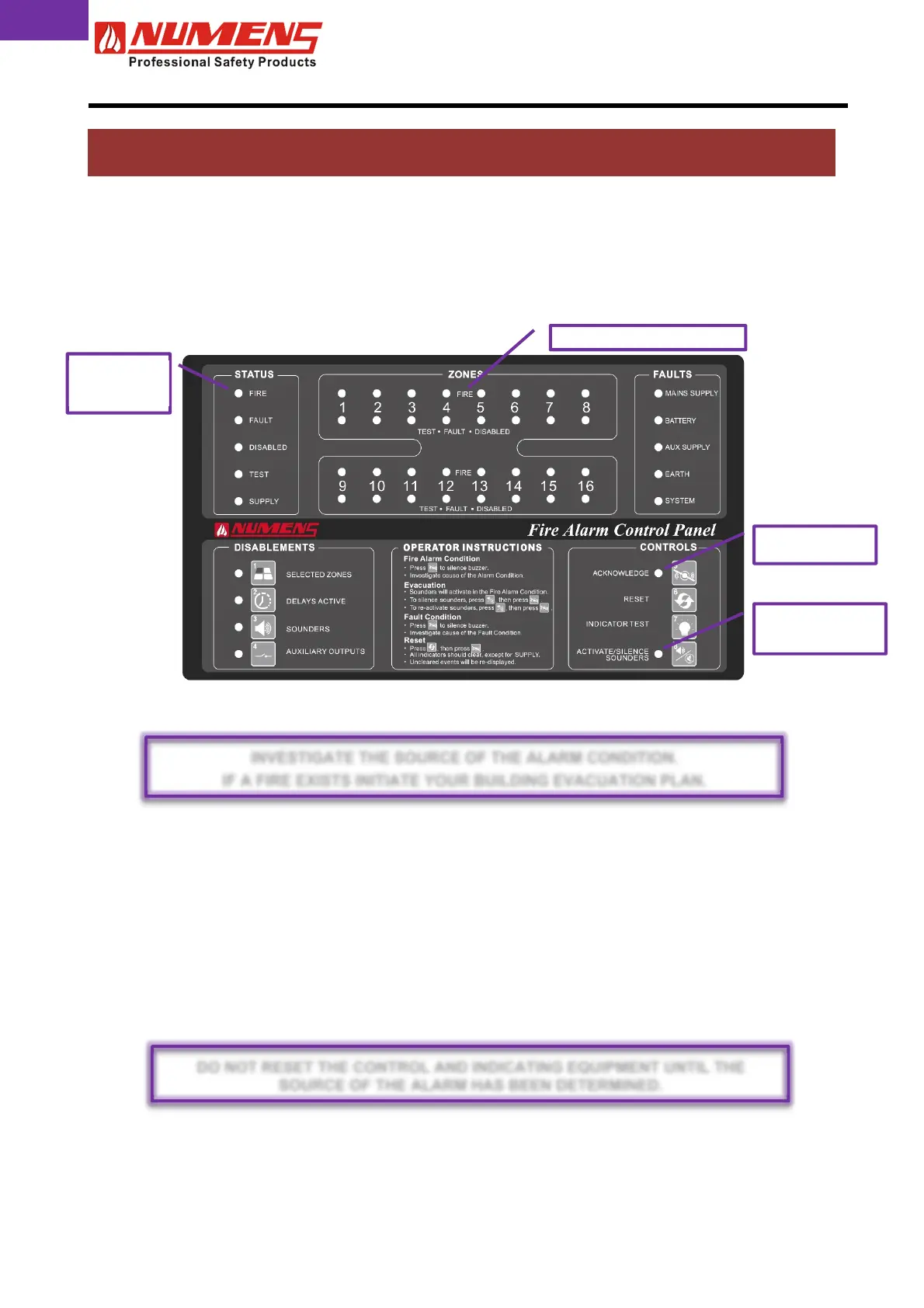1) Press ACKNOWLEDGE to acknowledge the Alarm and silence the internal sounder. The FIRE and