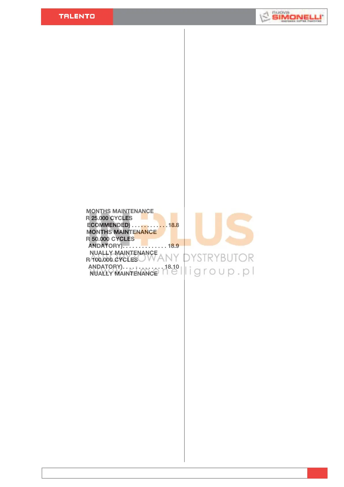 18.2 MAINTENANCE TALENTO SPECIAL . . 18.7