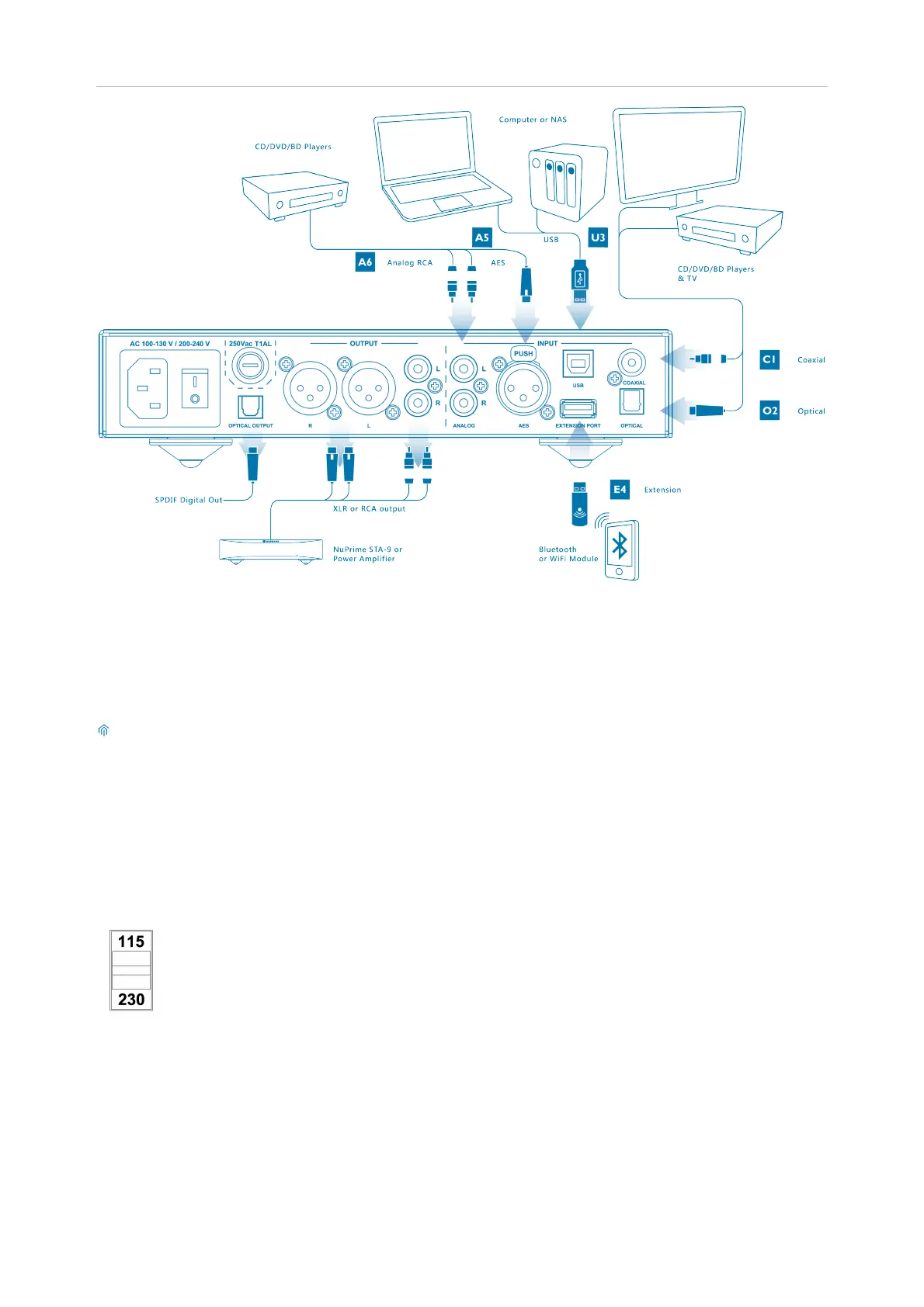 A6: Stereo analog for CD/DVD/BD players, TV and any analog source device.