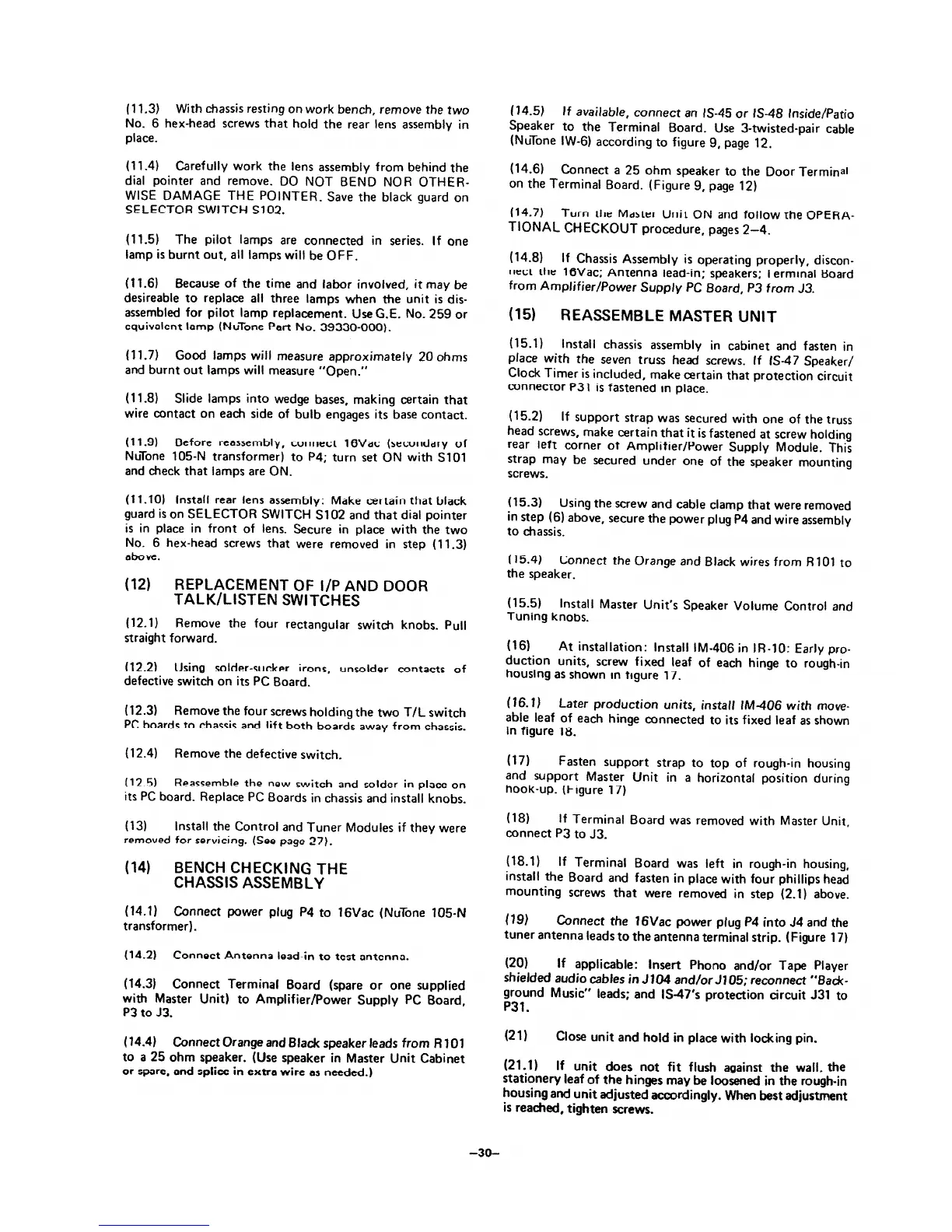 NuTone im-406 - Replacement of I;P and Door Talk;Listen Switches; Bench Checking the Chassis Assembly; Reassemble Master Unit