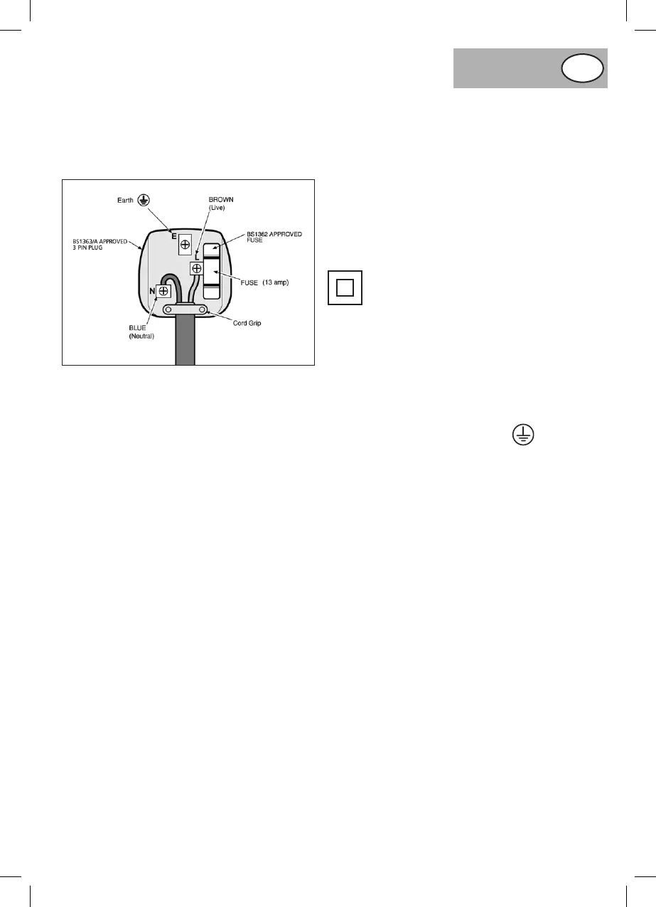 DO NOT CONNECT THE BROWN LIVE OR BLUE NEUTRAL TO THE EARTH PIN MARKED ‘E’ ON THE 3