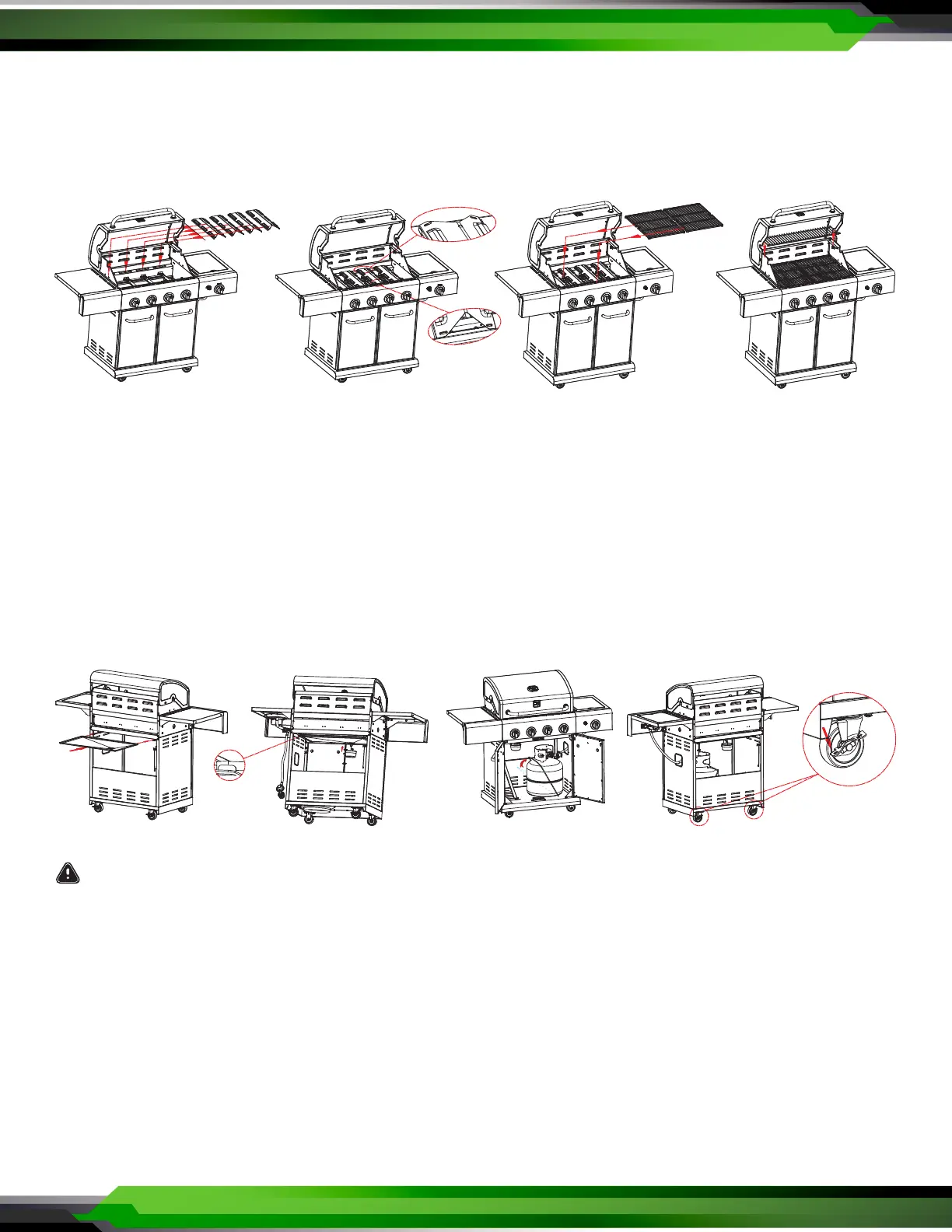 • When the grill is in the desired location, lock the caster brakes; this will help the grill stay in place for safe operation.